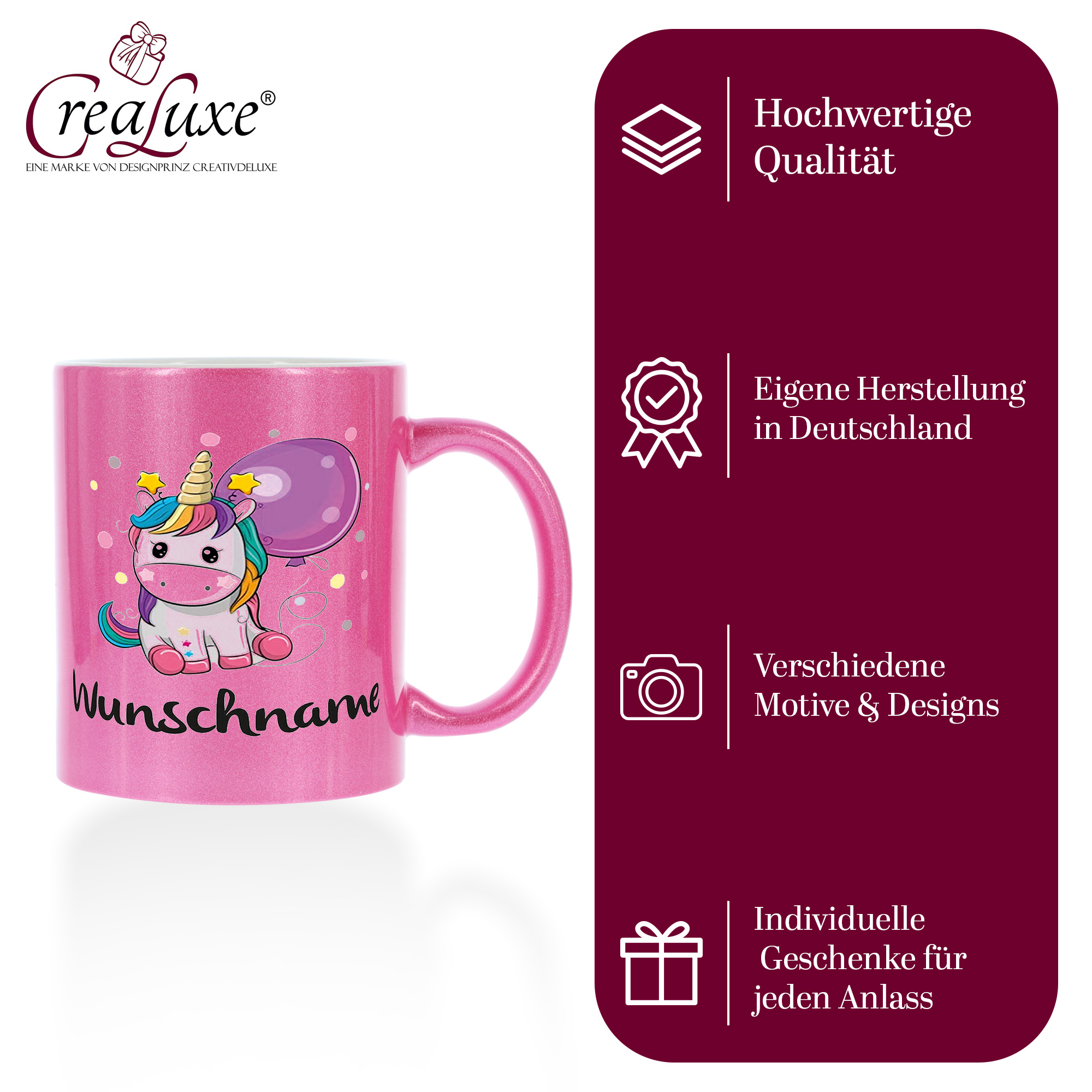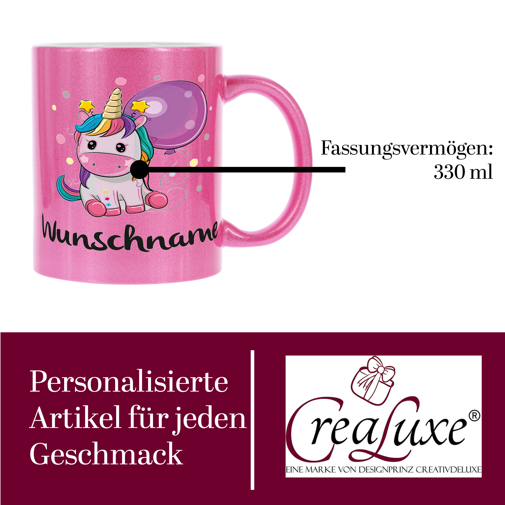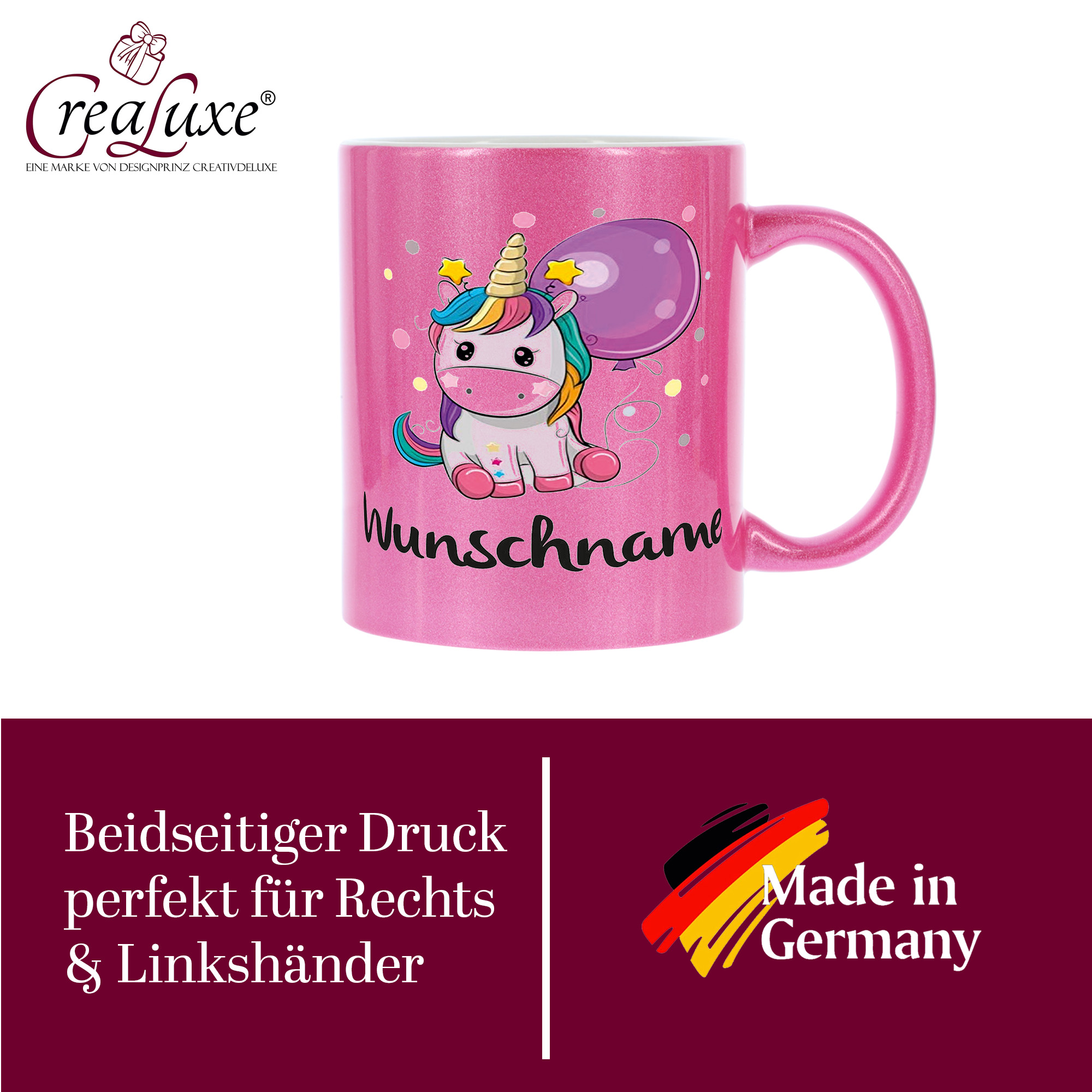 Crealuxe Glitzertasse - Einhorntasse Wunschname - personalisiert, Kaffeetasse, Bürotasse (Perlmutt)