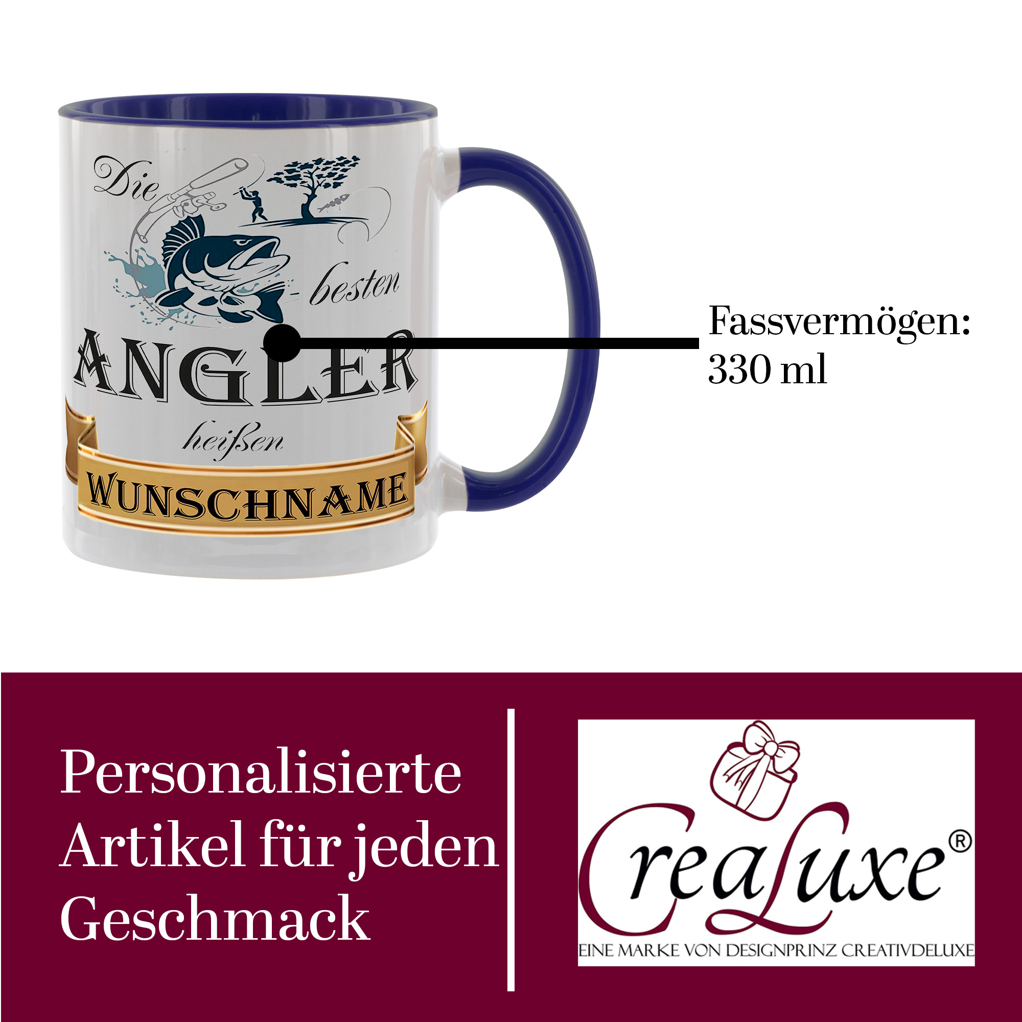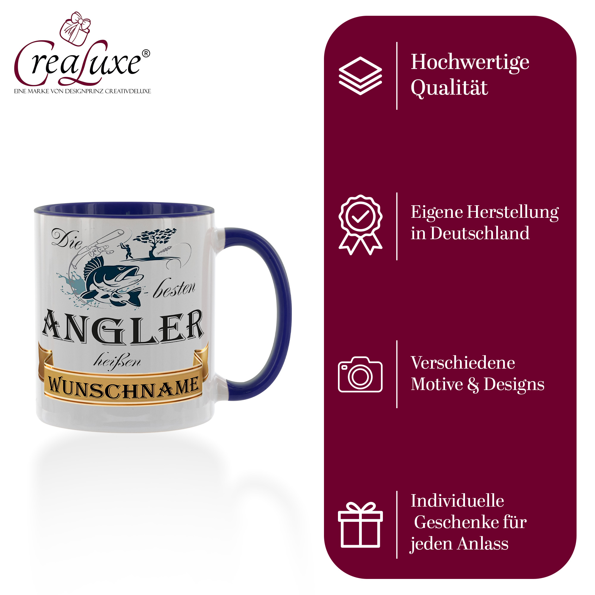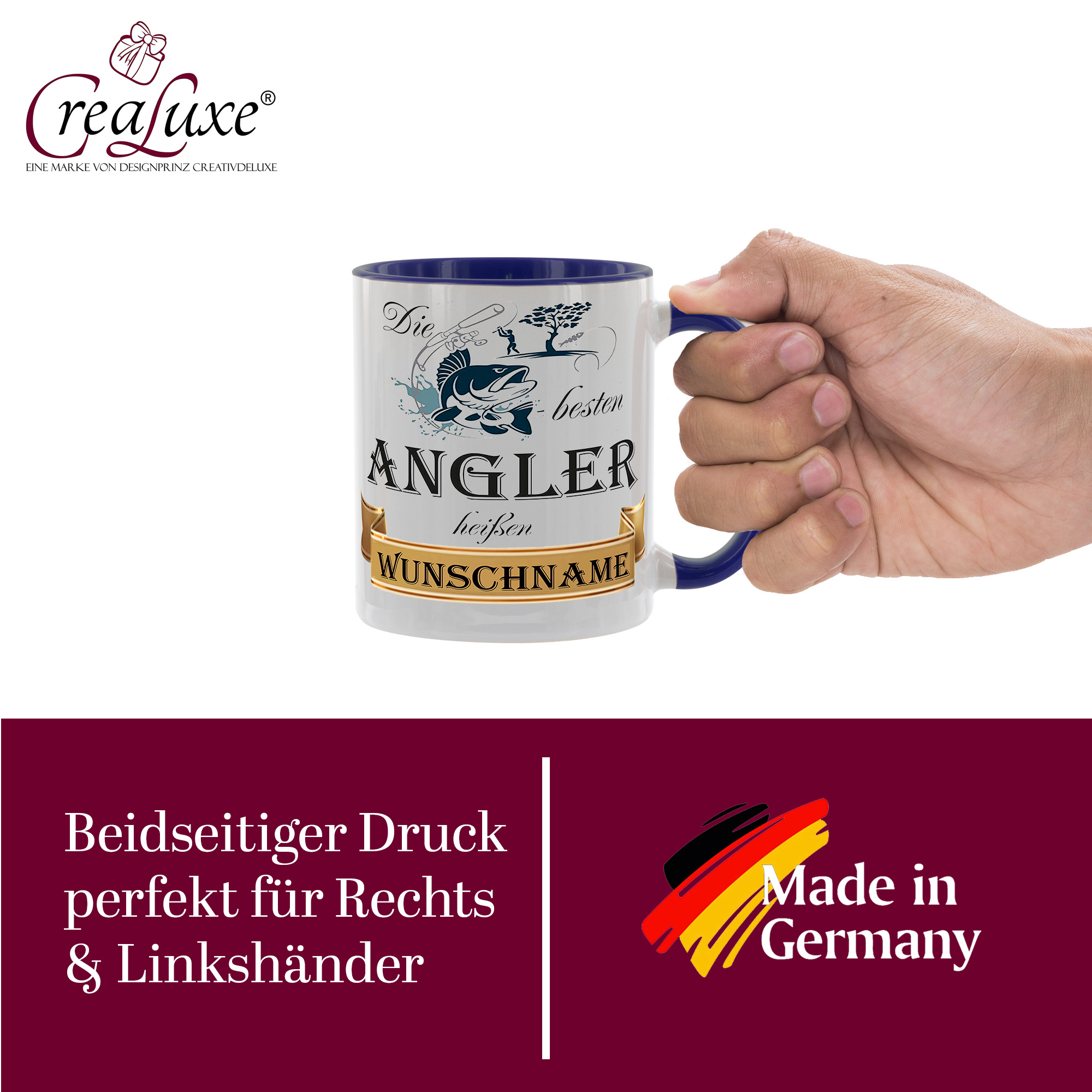 Crealuxe Kaffeetasse - Die besten Angler heißen Wunschname - personalisiert, Spruchtasse, hochwertige Keramiktasse (Blau)