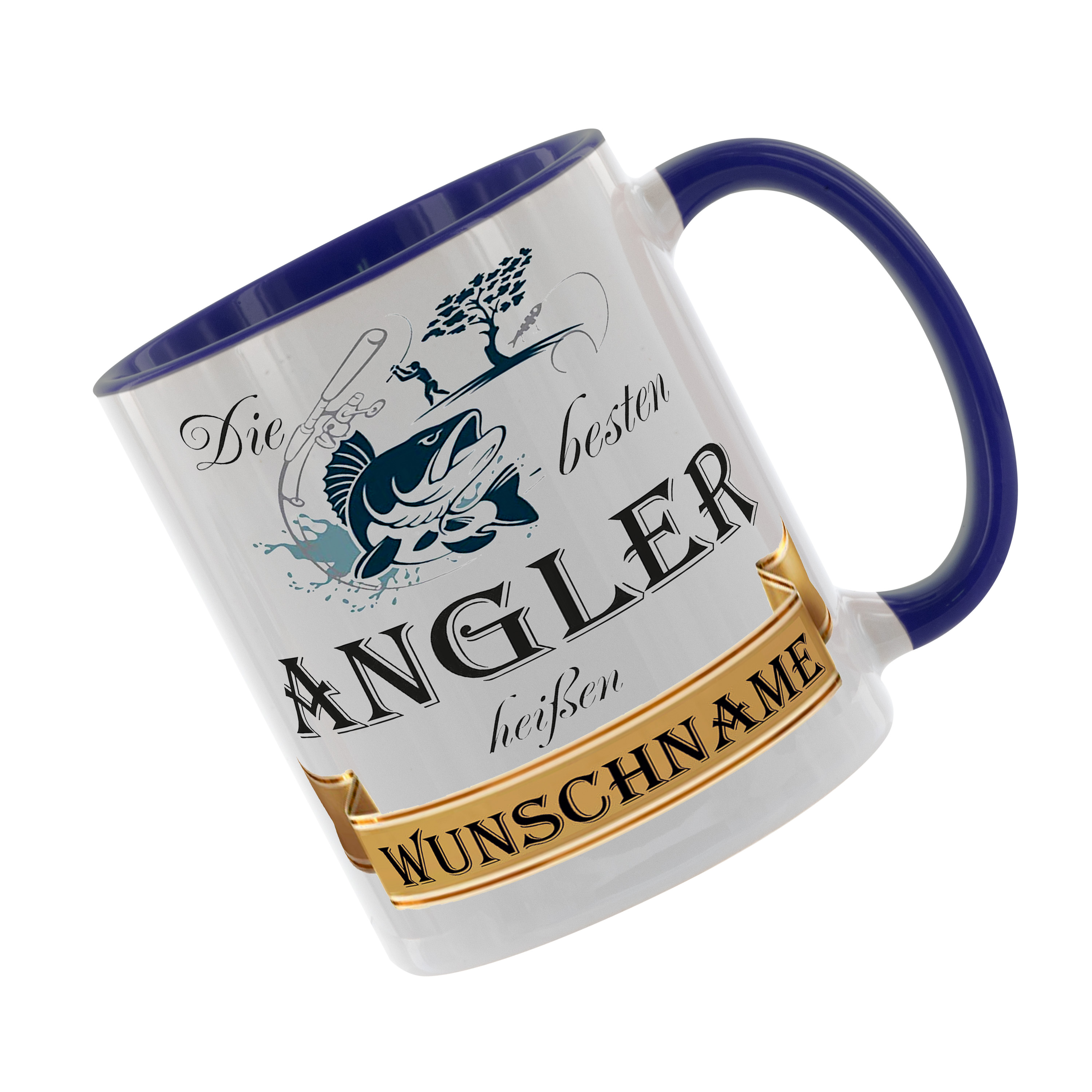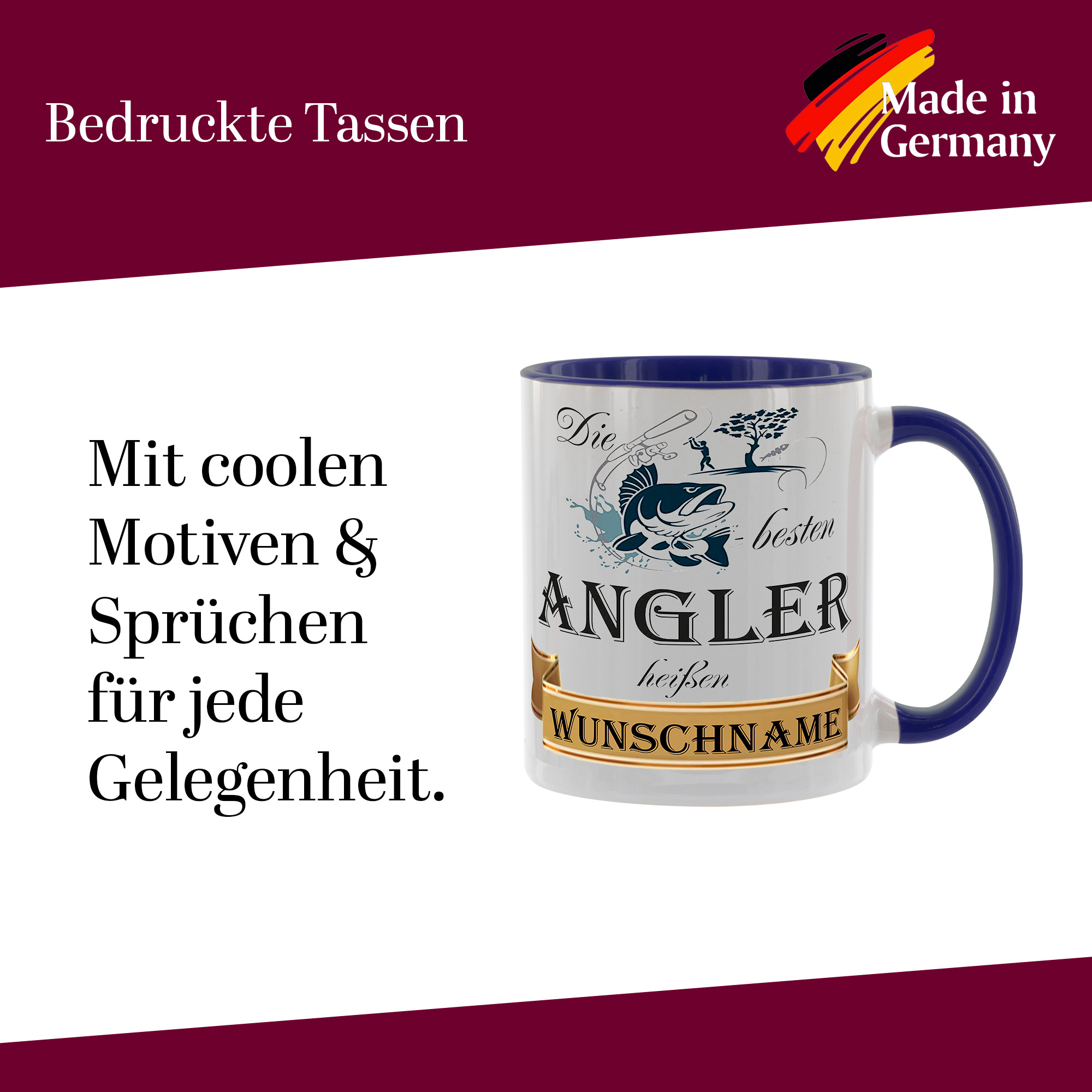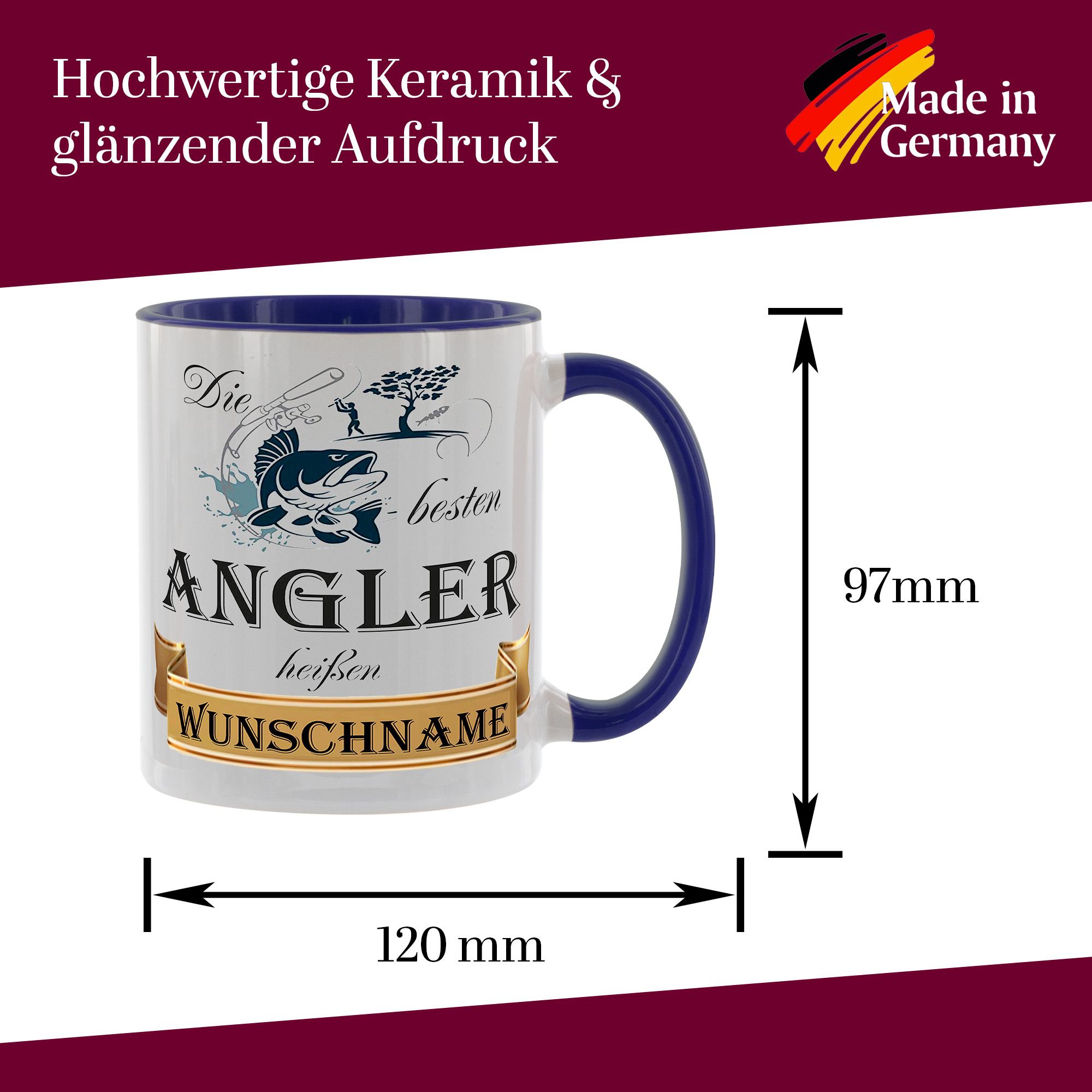 Crealuxe Kaffeetasse - Die besten Angler heißen Wunschname - personalisiert, Spruchtasse, hochwertige Keramiktasse (Blau)