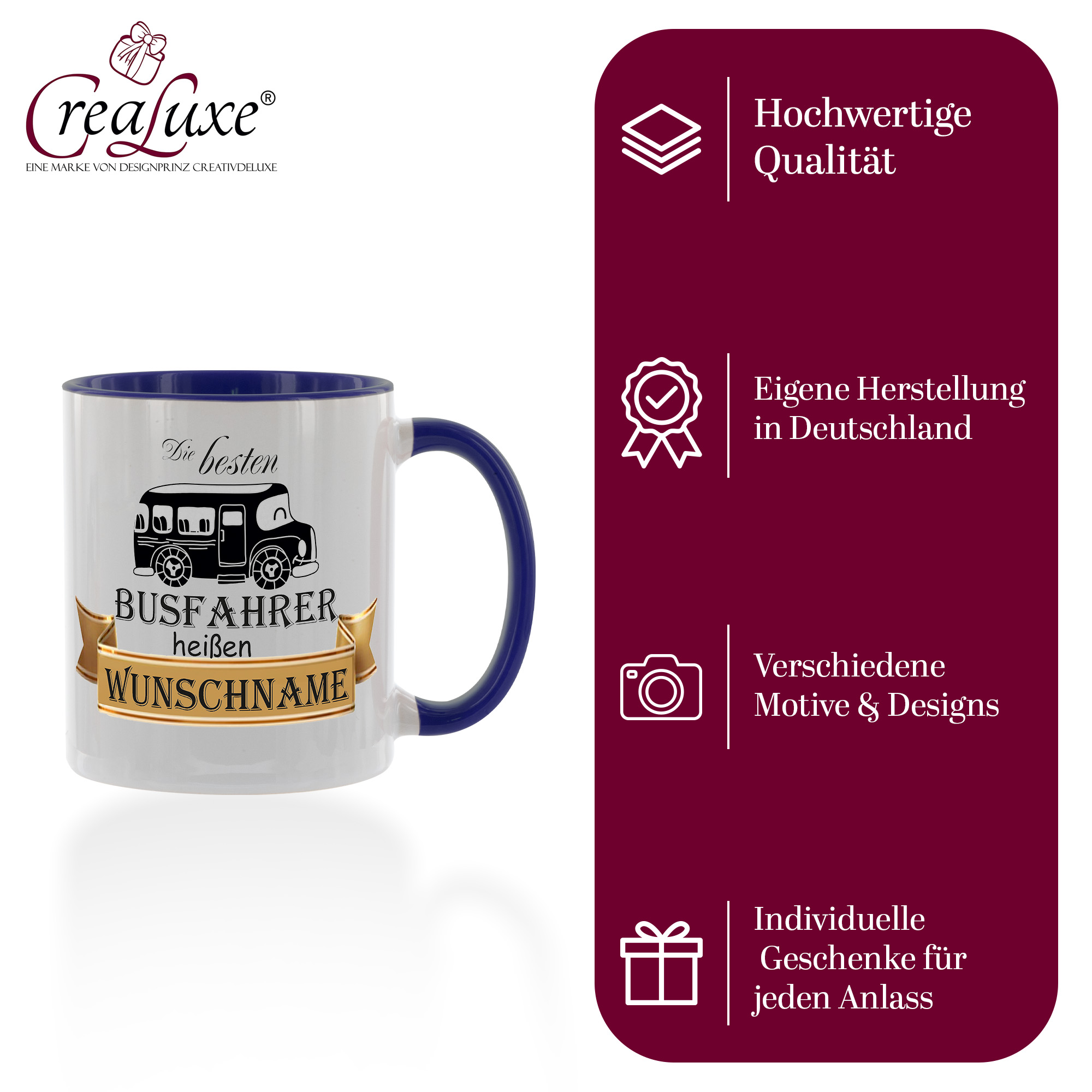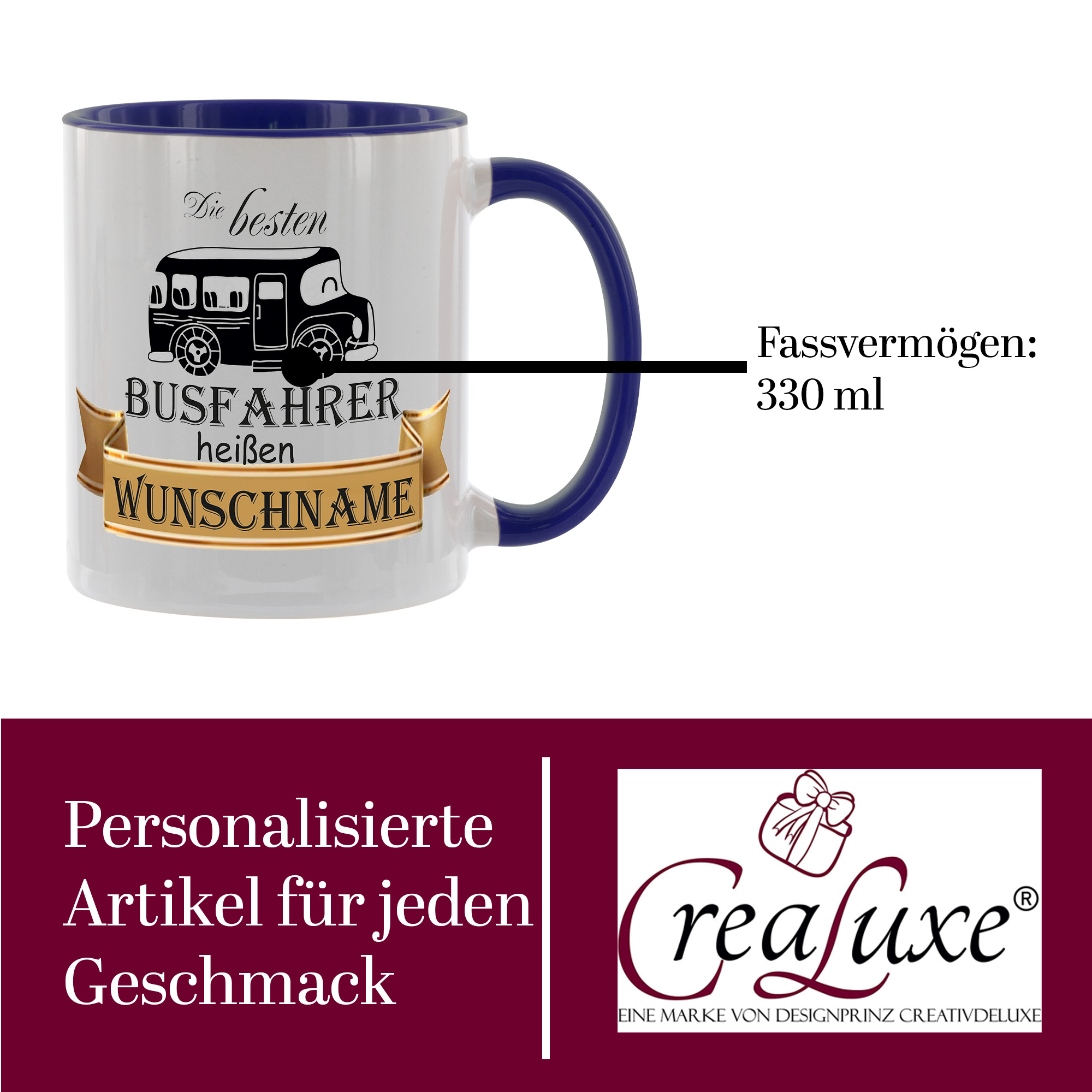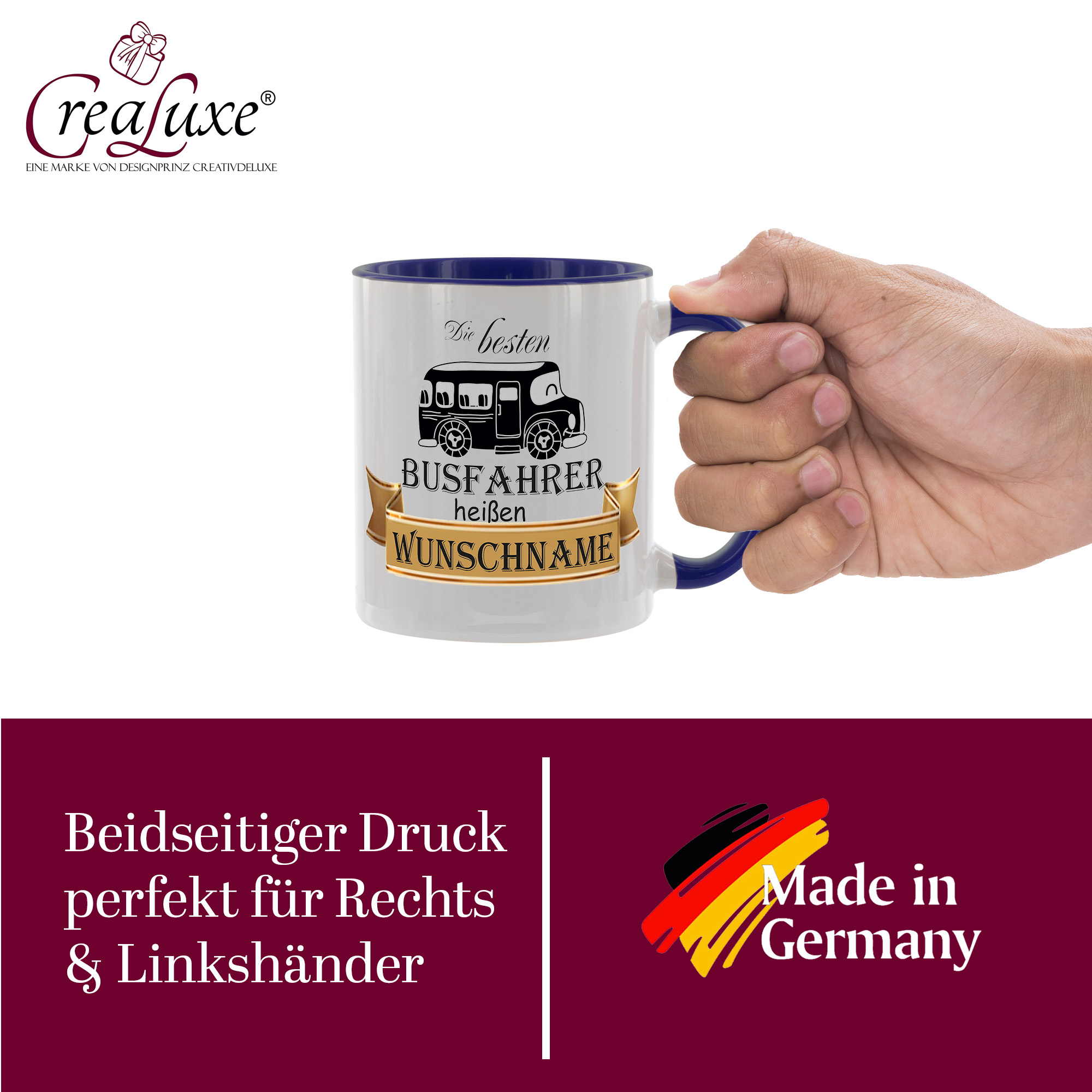 Crealuxe Kaffeetasse - Die besten Busfahrer heißen Wunschname - personalisiert, Spruchtasse, hochwertige Keramiktasse (Blau)