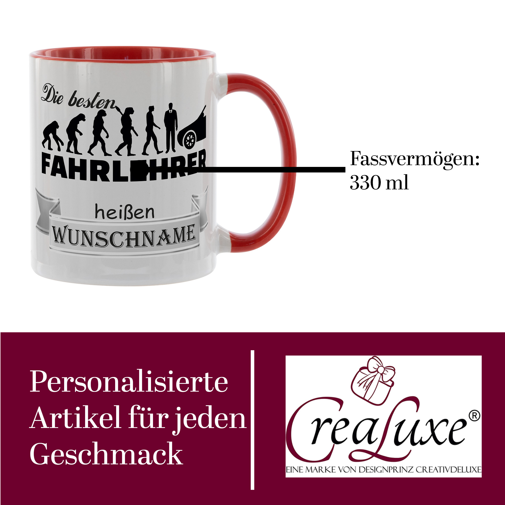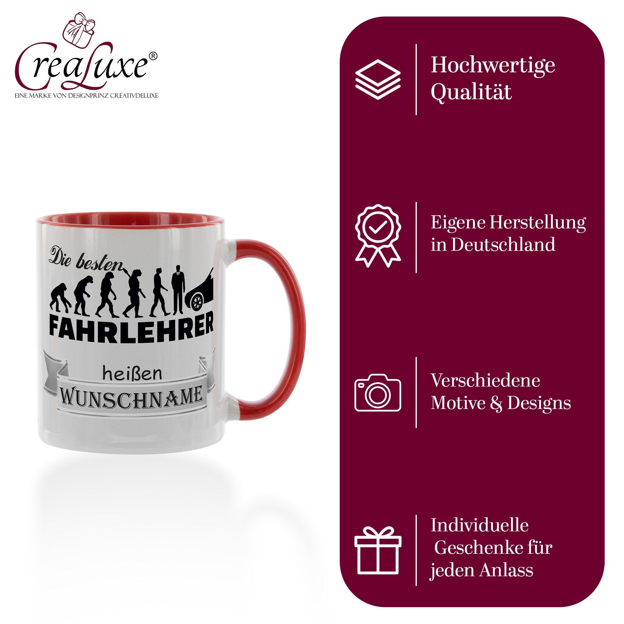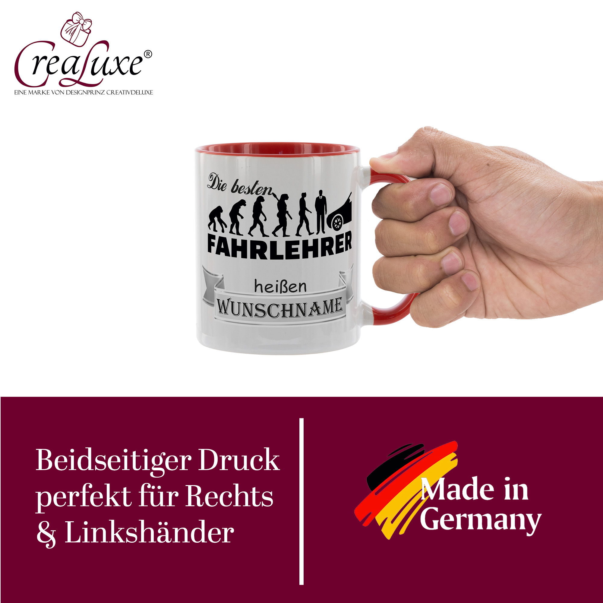 Crealuxe Kaffeetasse - Die besten Fahrlehrer heißen Wunschname - personalisiert, Spruchtasse, hochwertige Keramiktasse (Rot)