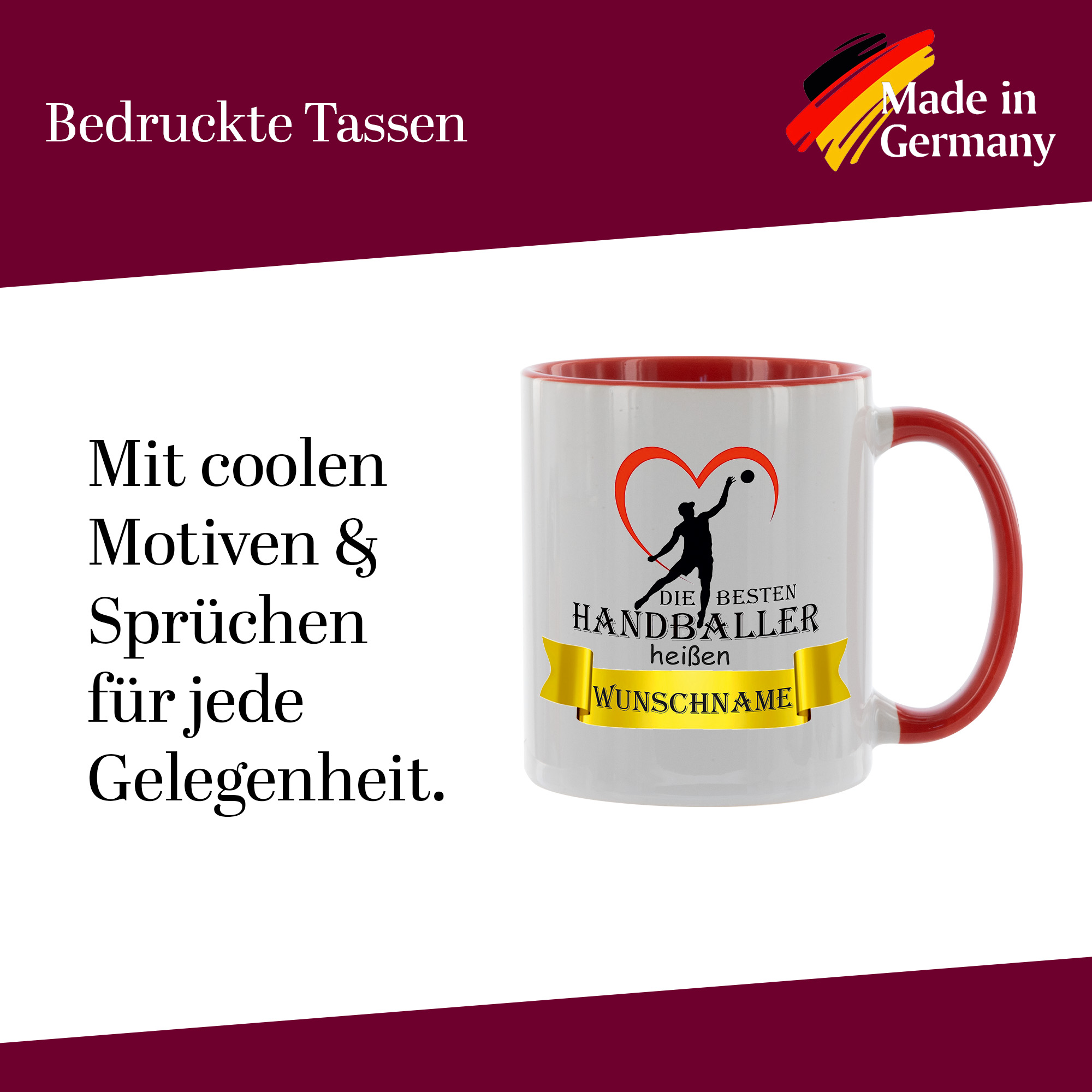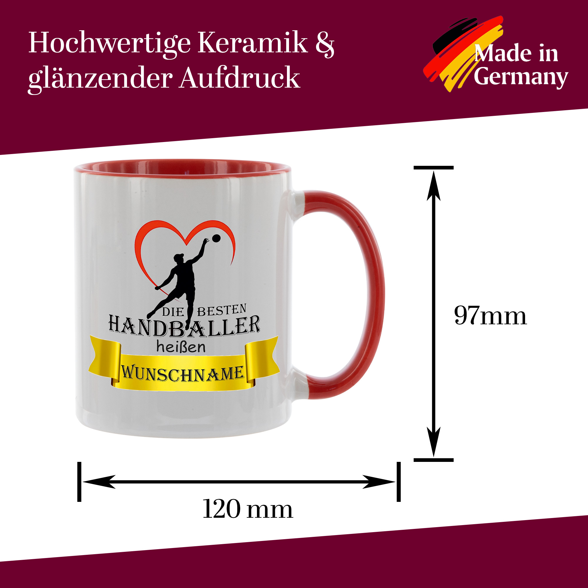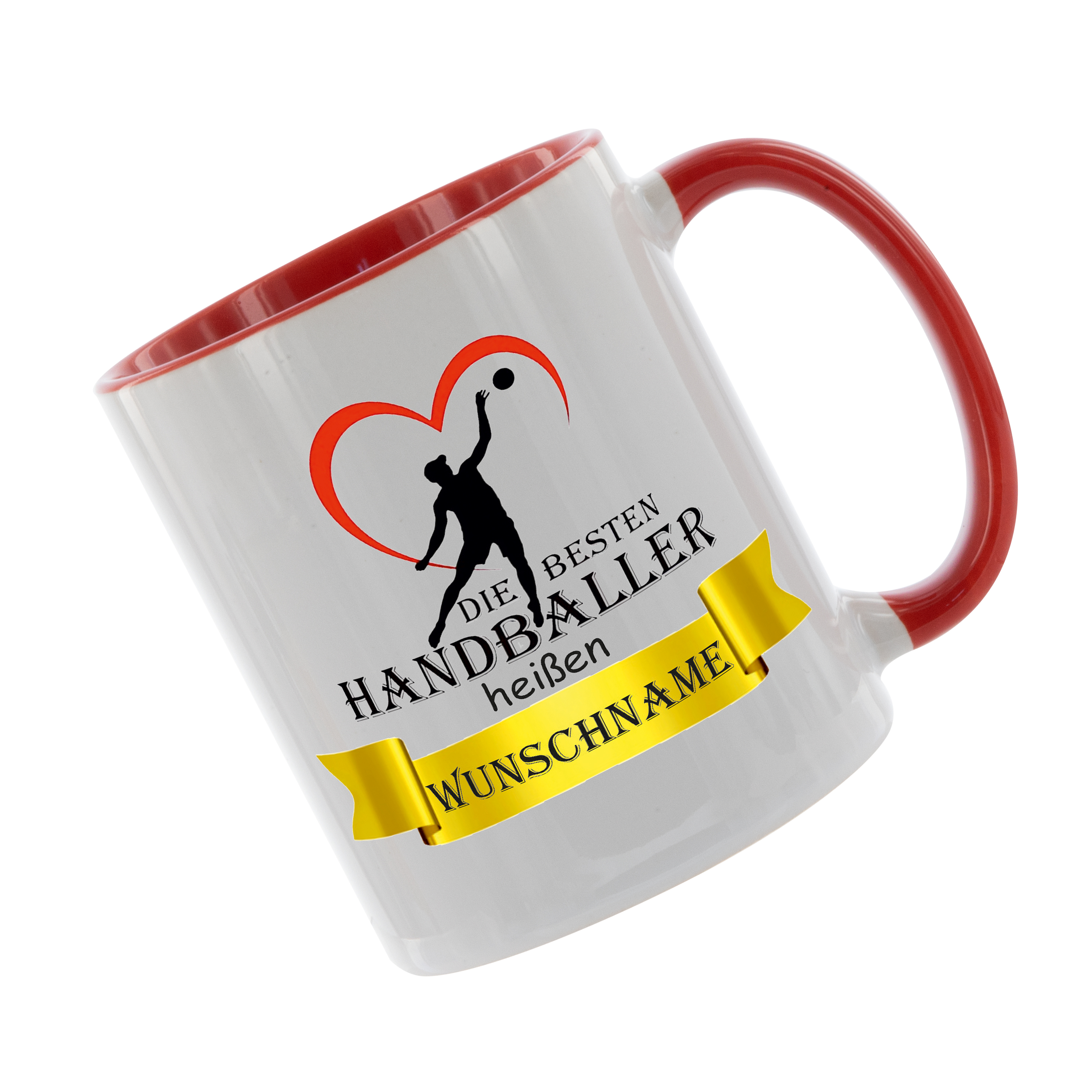 Crealuxe Kaffeetasse - Die besten Handballer heißen Wunschname - personalisiert, Spruchtasse, hochwertige Keramiktasse (Rot)