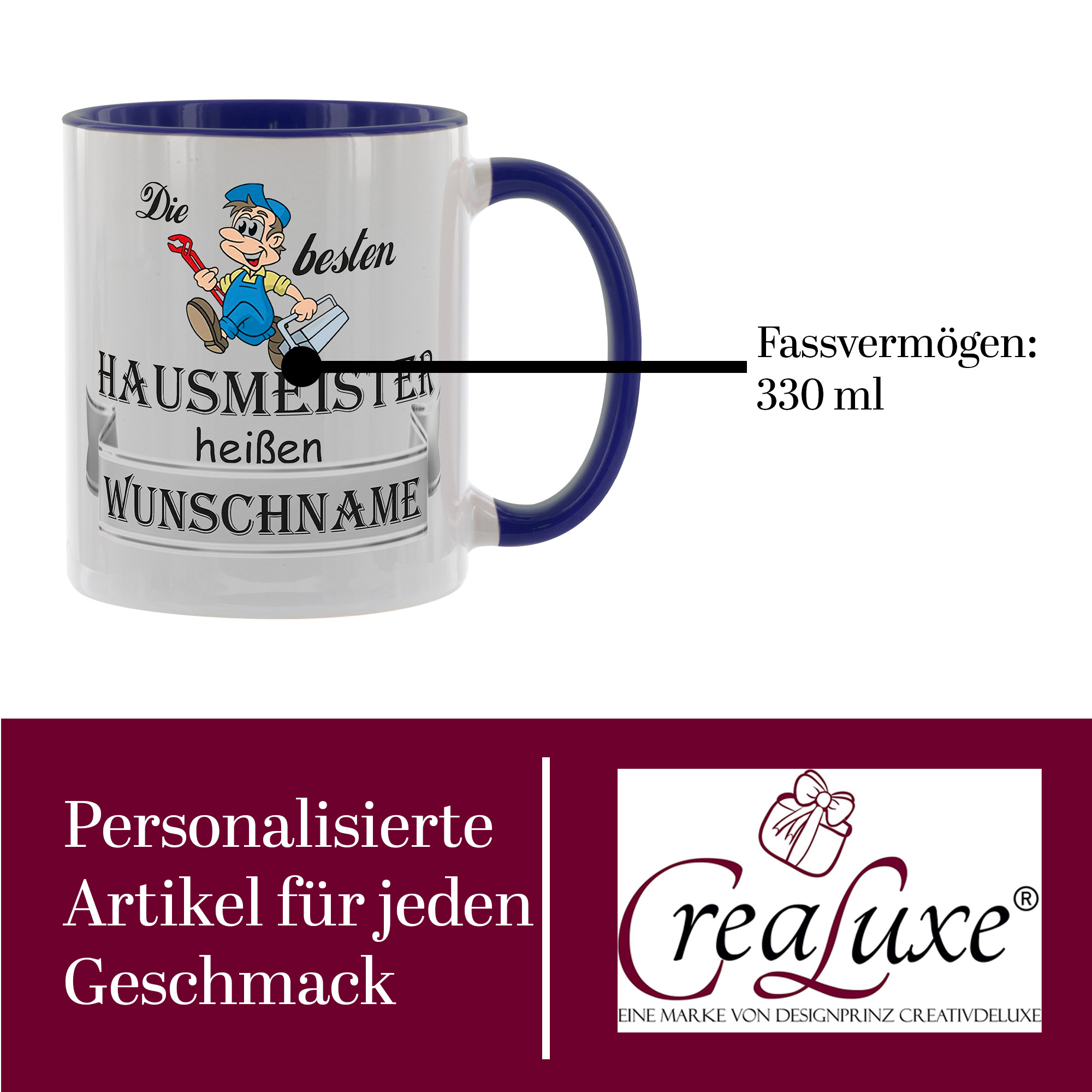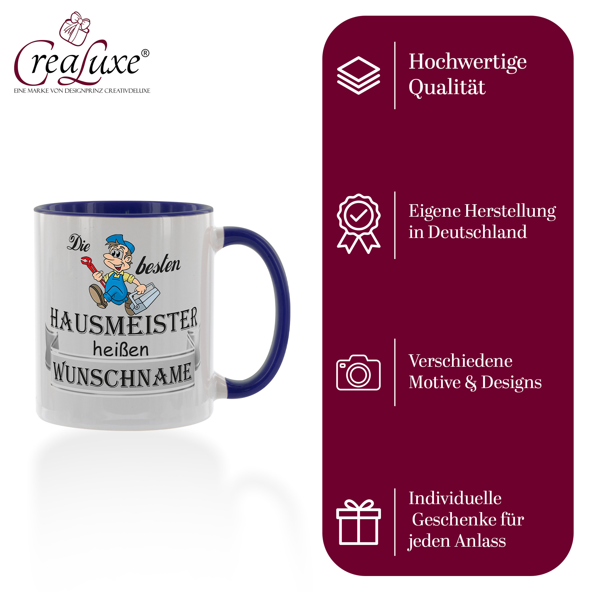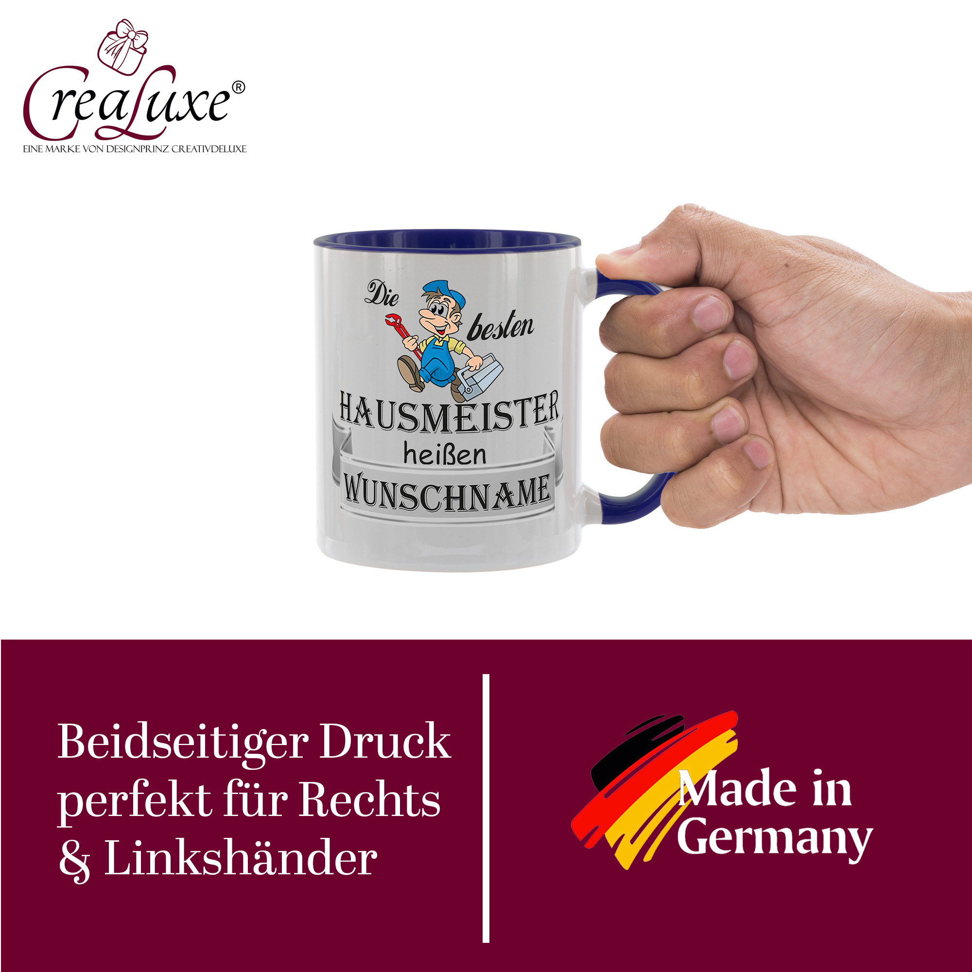 Crealuxe Kaffeetasse - Die besten Hausmeister heißen Wunschname - personalisiert, Spruchtasse, hochwertige Keramiktasse (Blau)
