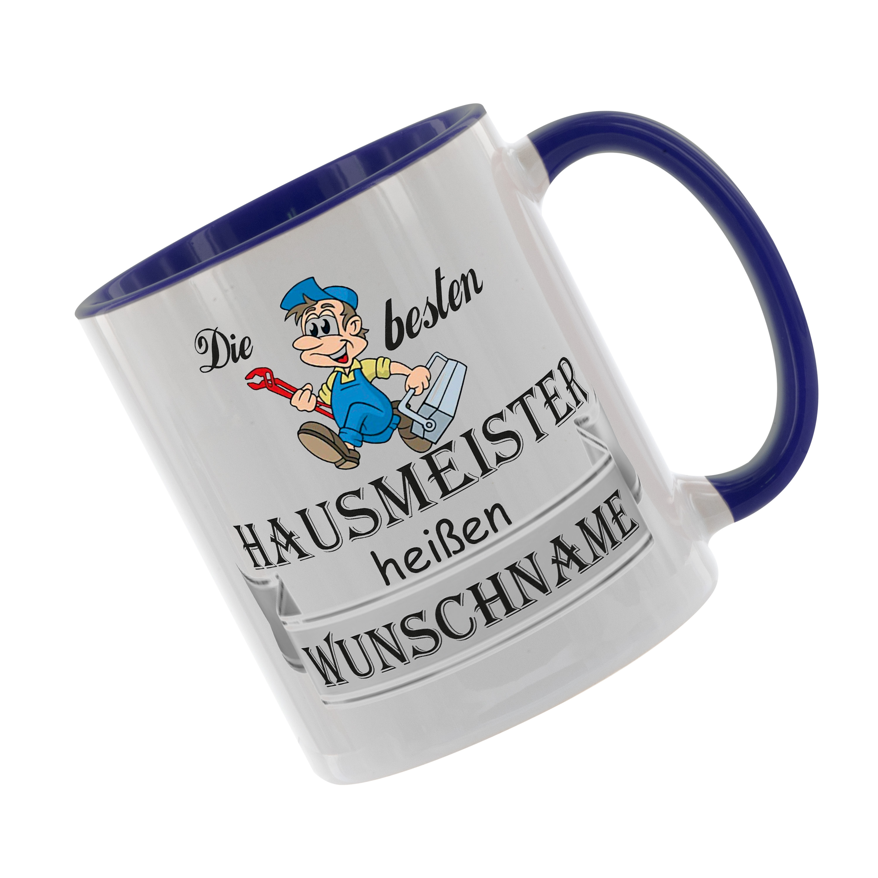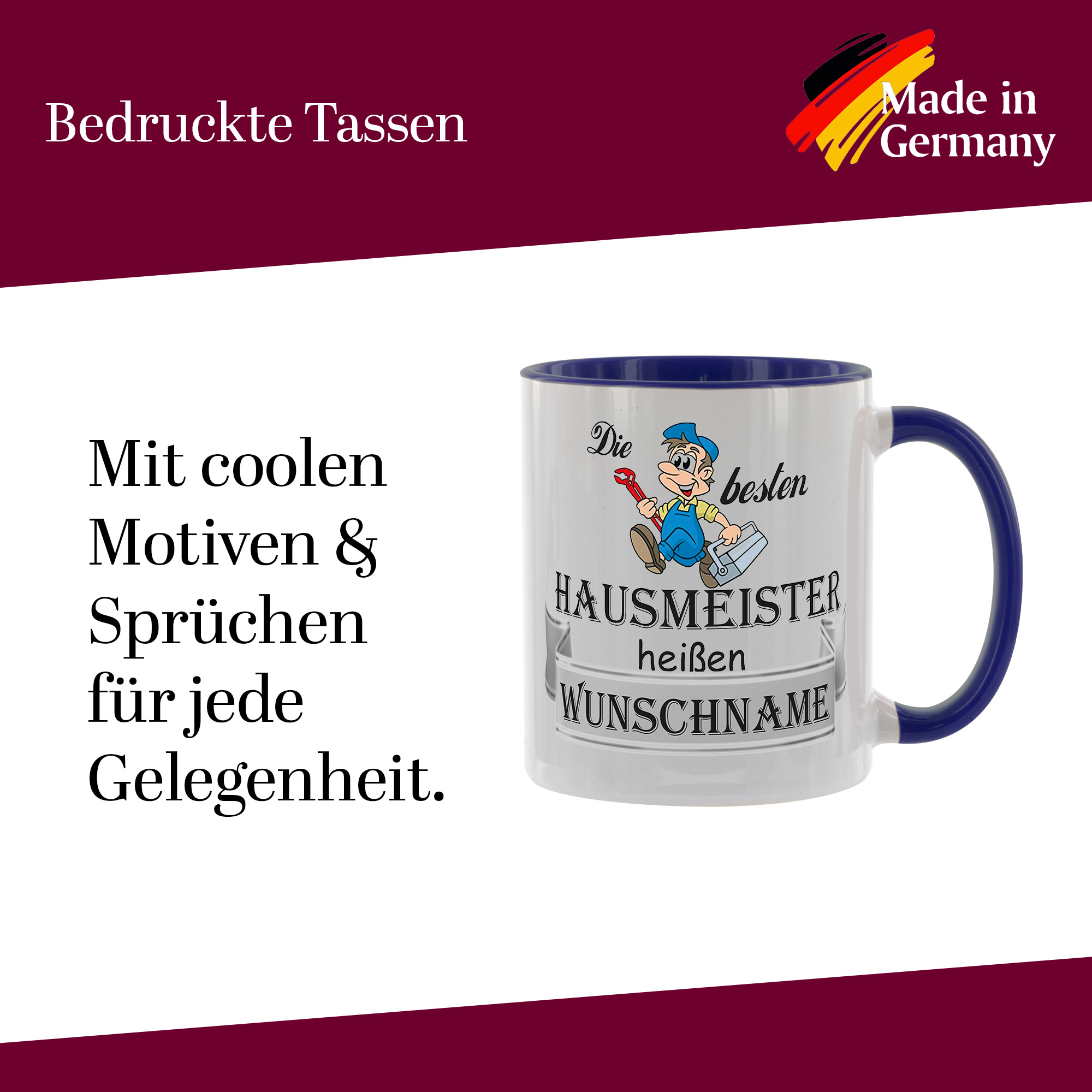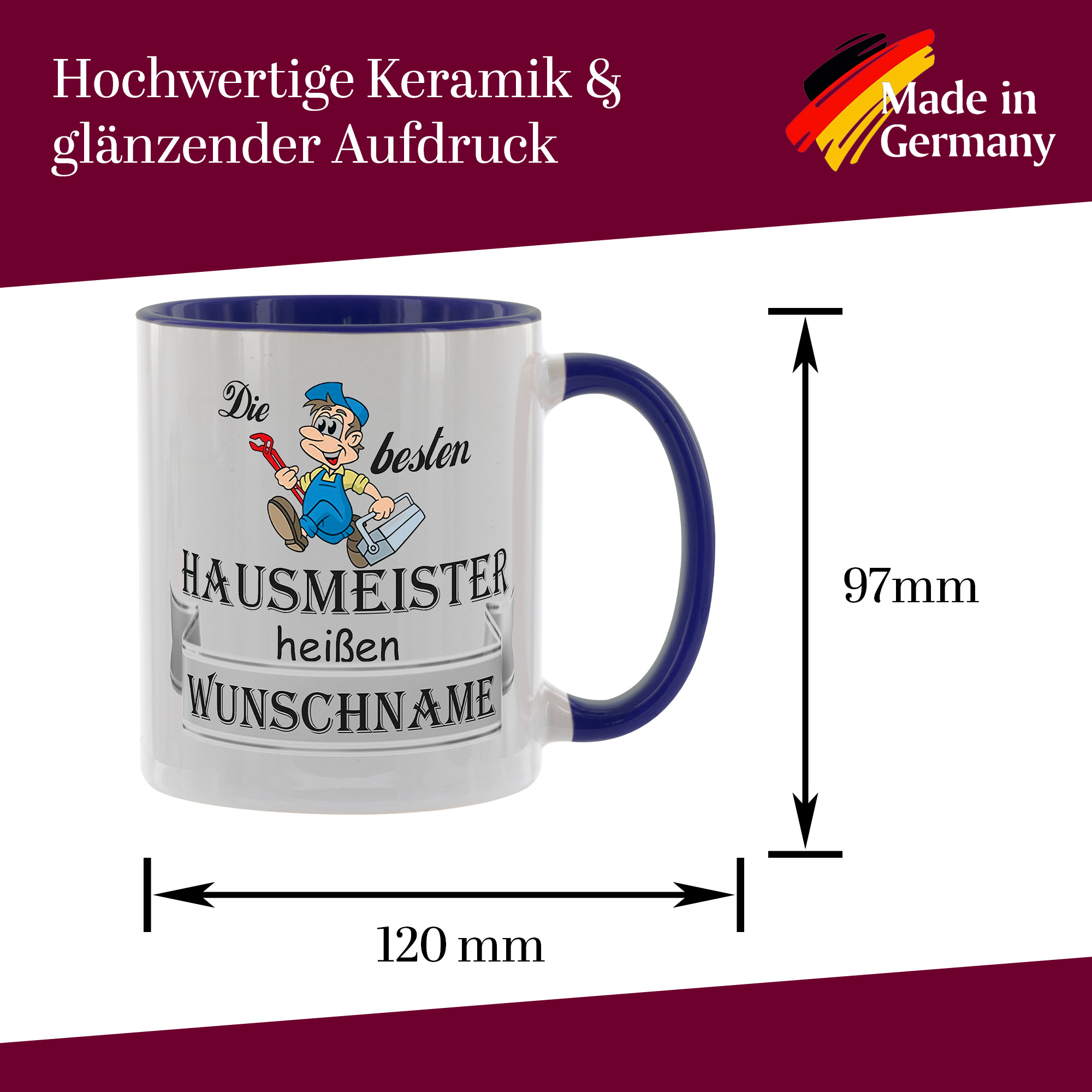 Crealuxe Kaffeetasse - Die besten Hausmeister heißen Wunschname - personalisiert, Spruchtasse, hochwertige Keramiktasse (Blau)