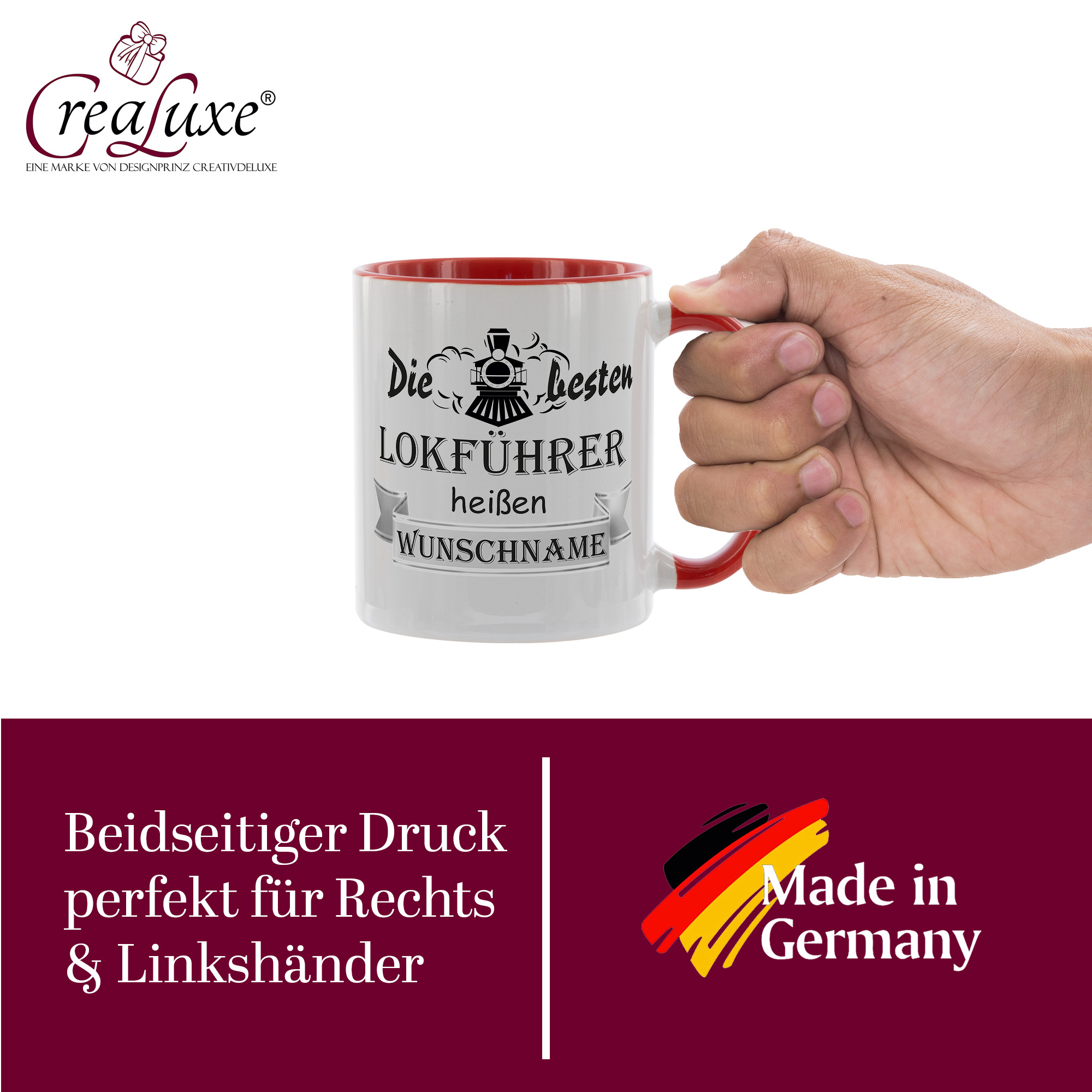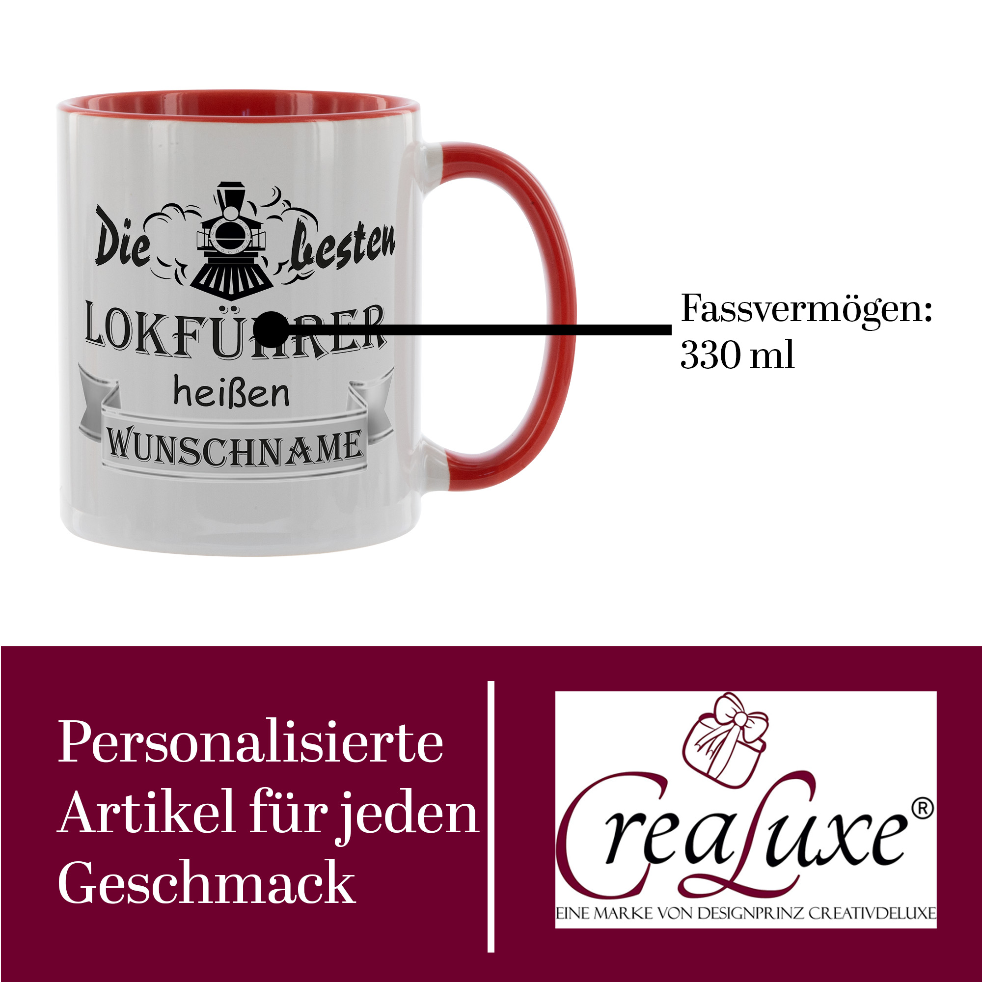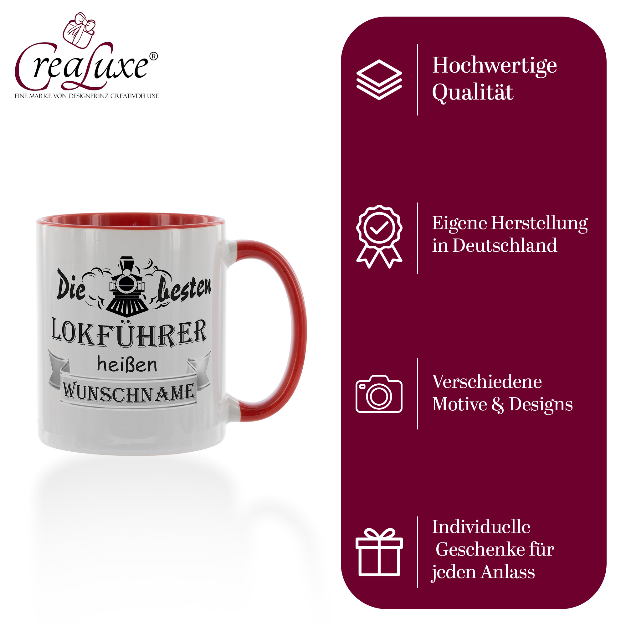 Crealuxe Kaffeetasse - Die besten Lokführer heißen Wunschname - personalisiert, Spruchtasse, hochwertige Keramiktasse (Rot)