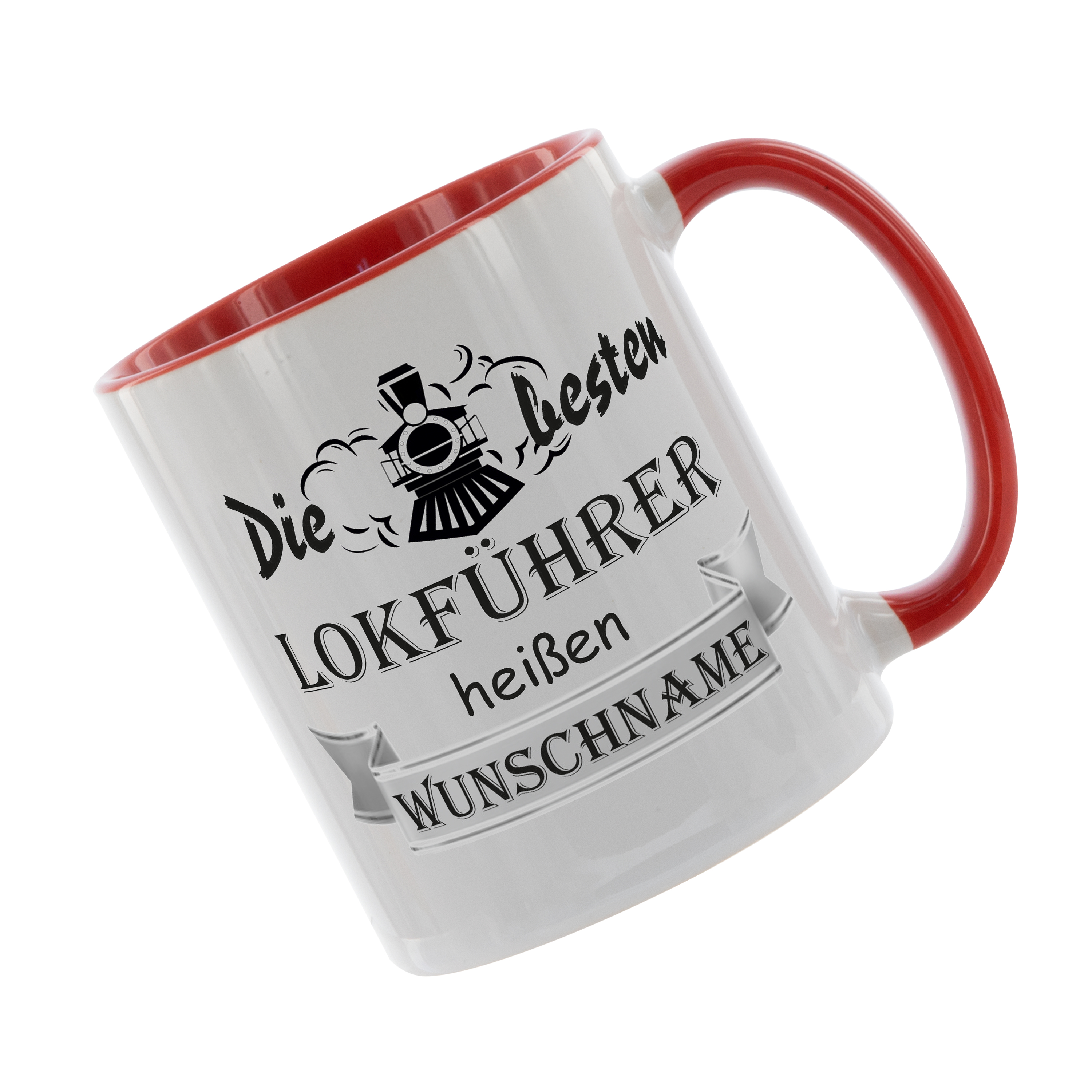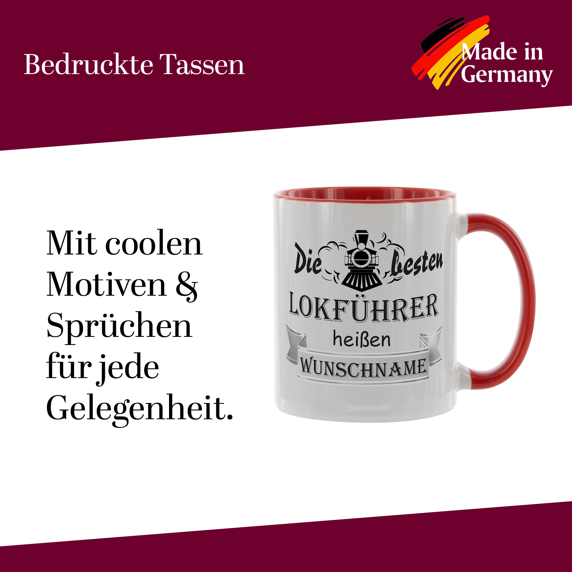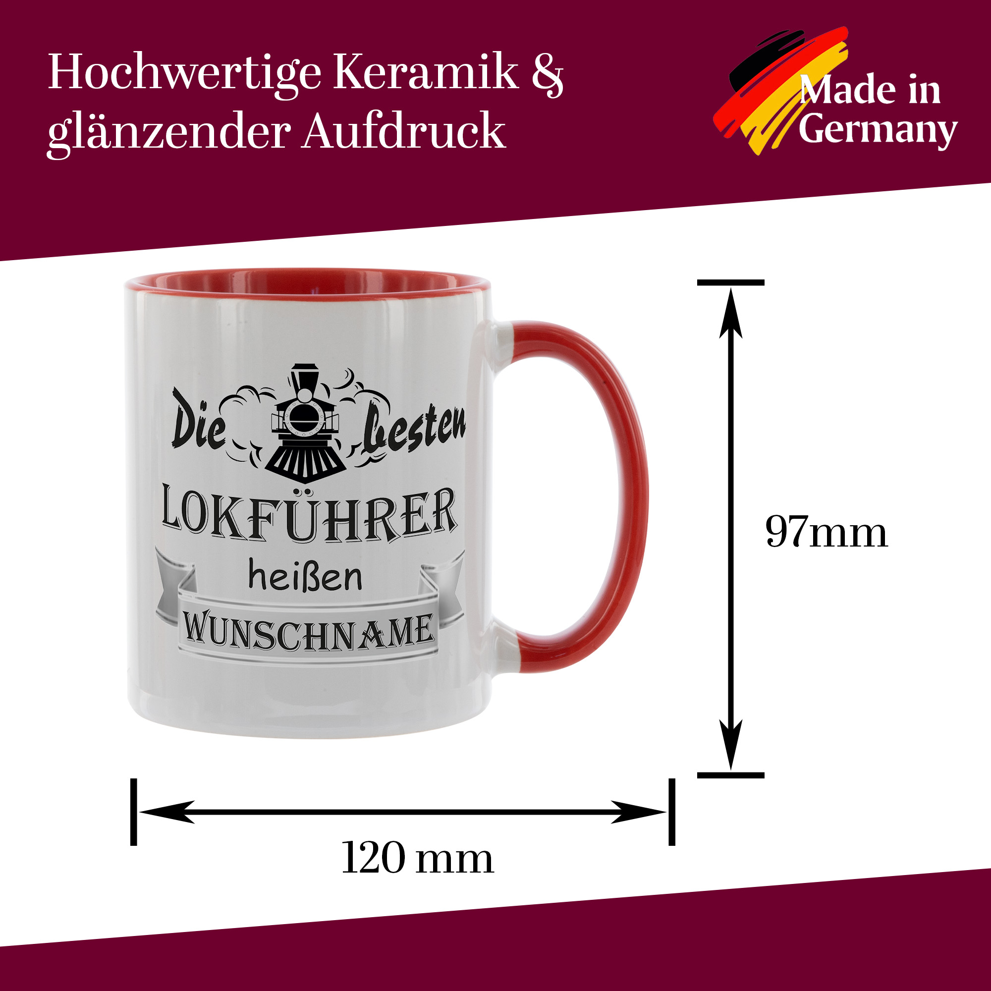 Crealuxe Kaffeetasse - Die besten Lokführer heißen Wunschname - personalisiert, Spruchtasse, hochwertige Keramiktasse (Rot)