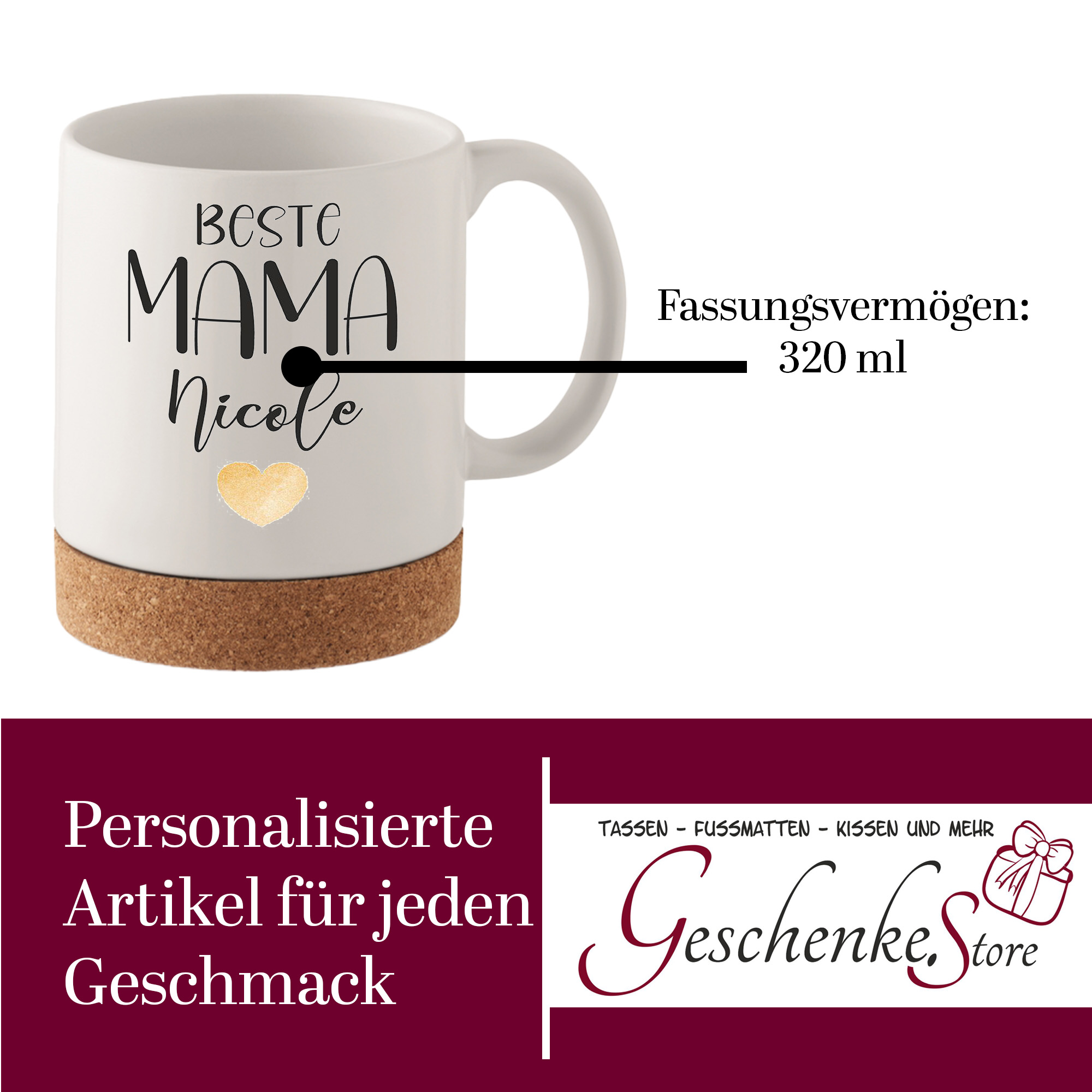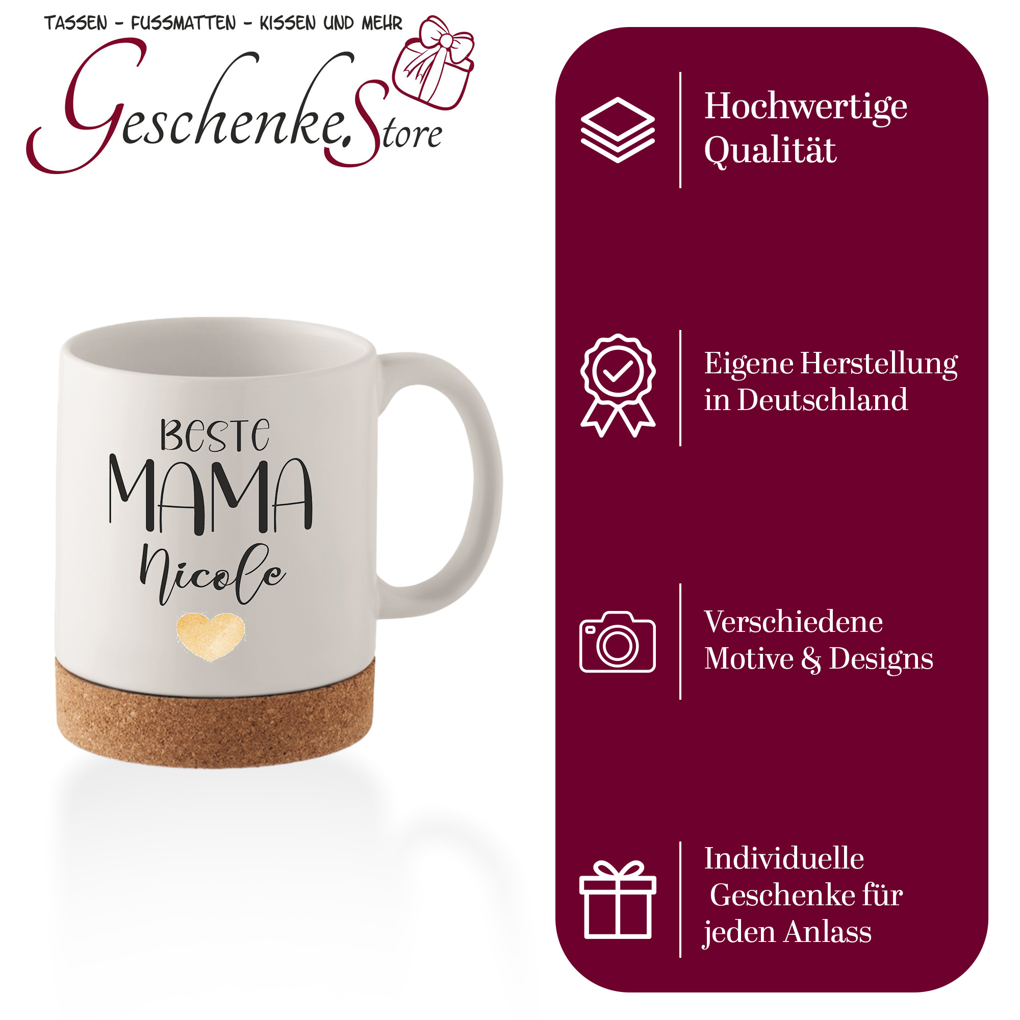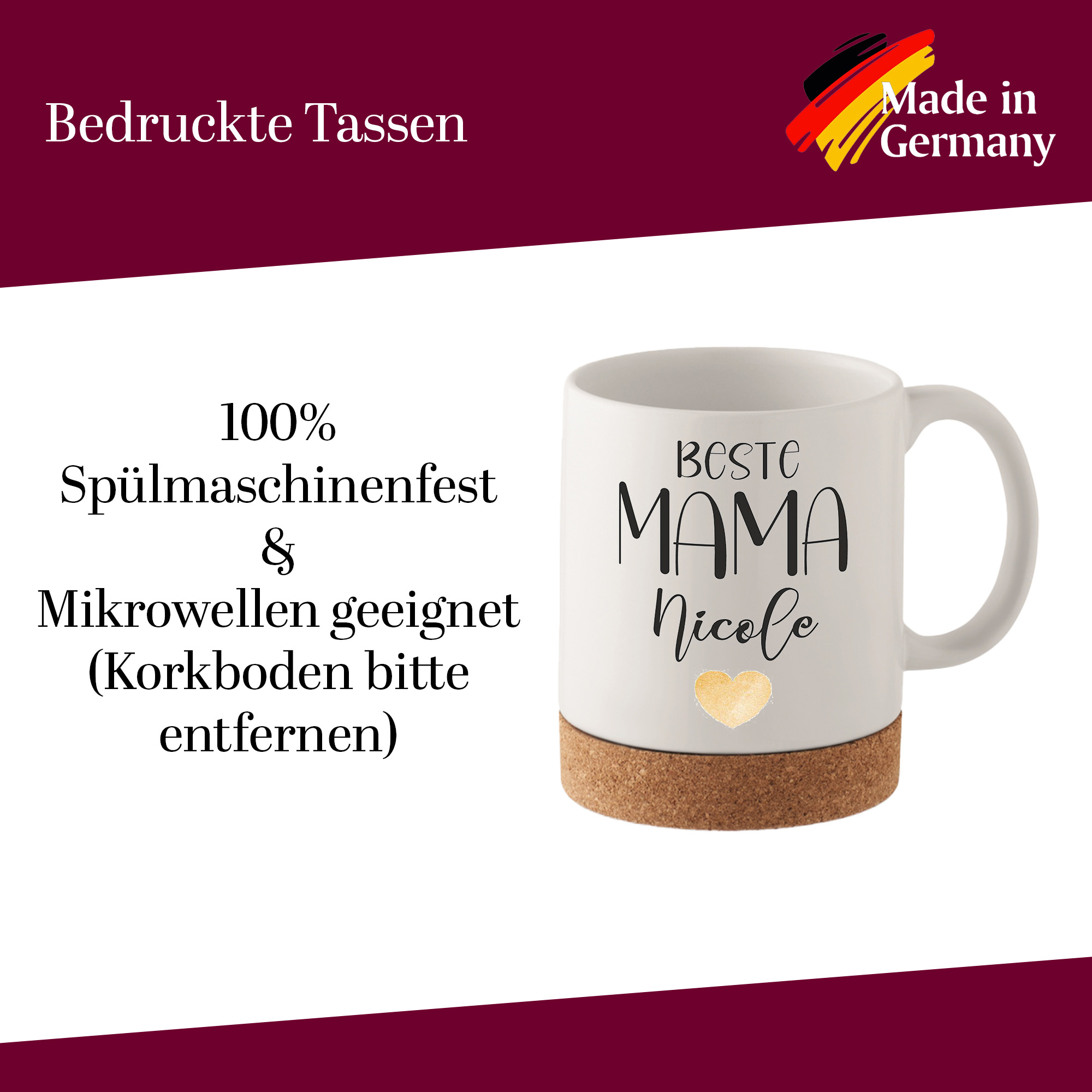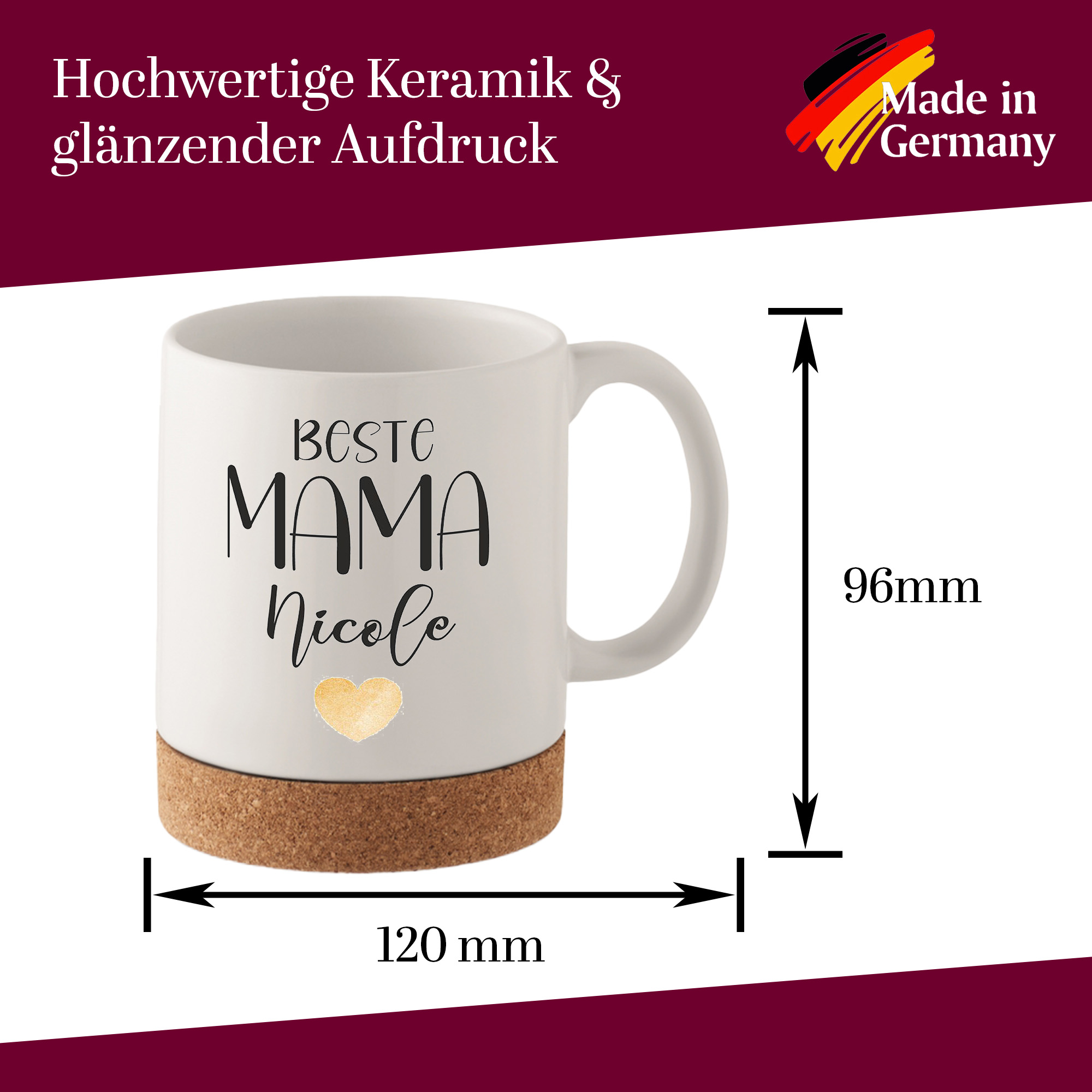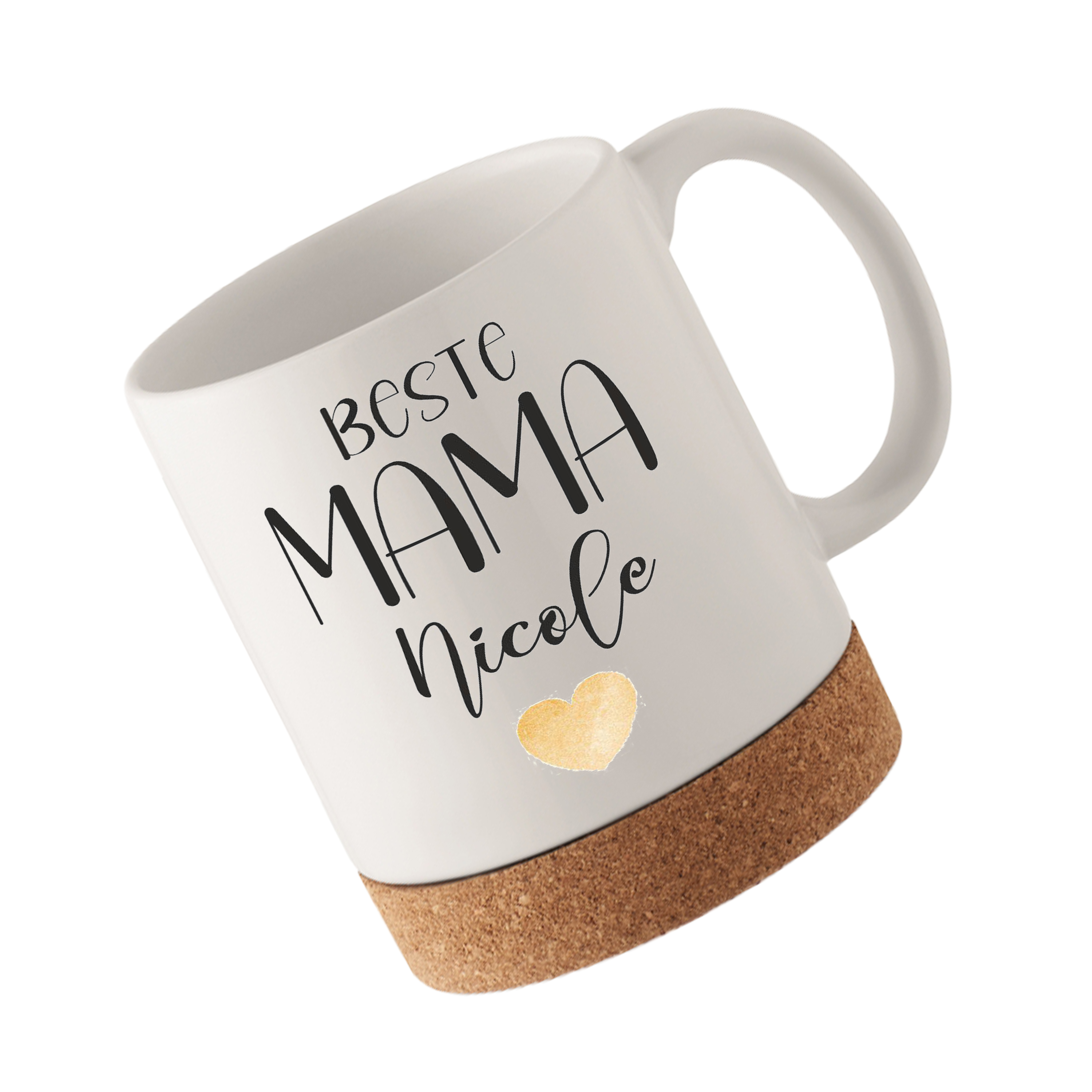 Crealuxe Kaffeetasse mit Korkboden - Beste Mama Wunschname - personalisiert, Spruchtasse, hochwertige Keramiktasse, Geschenk zum Muttertag (Weiss)