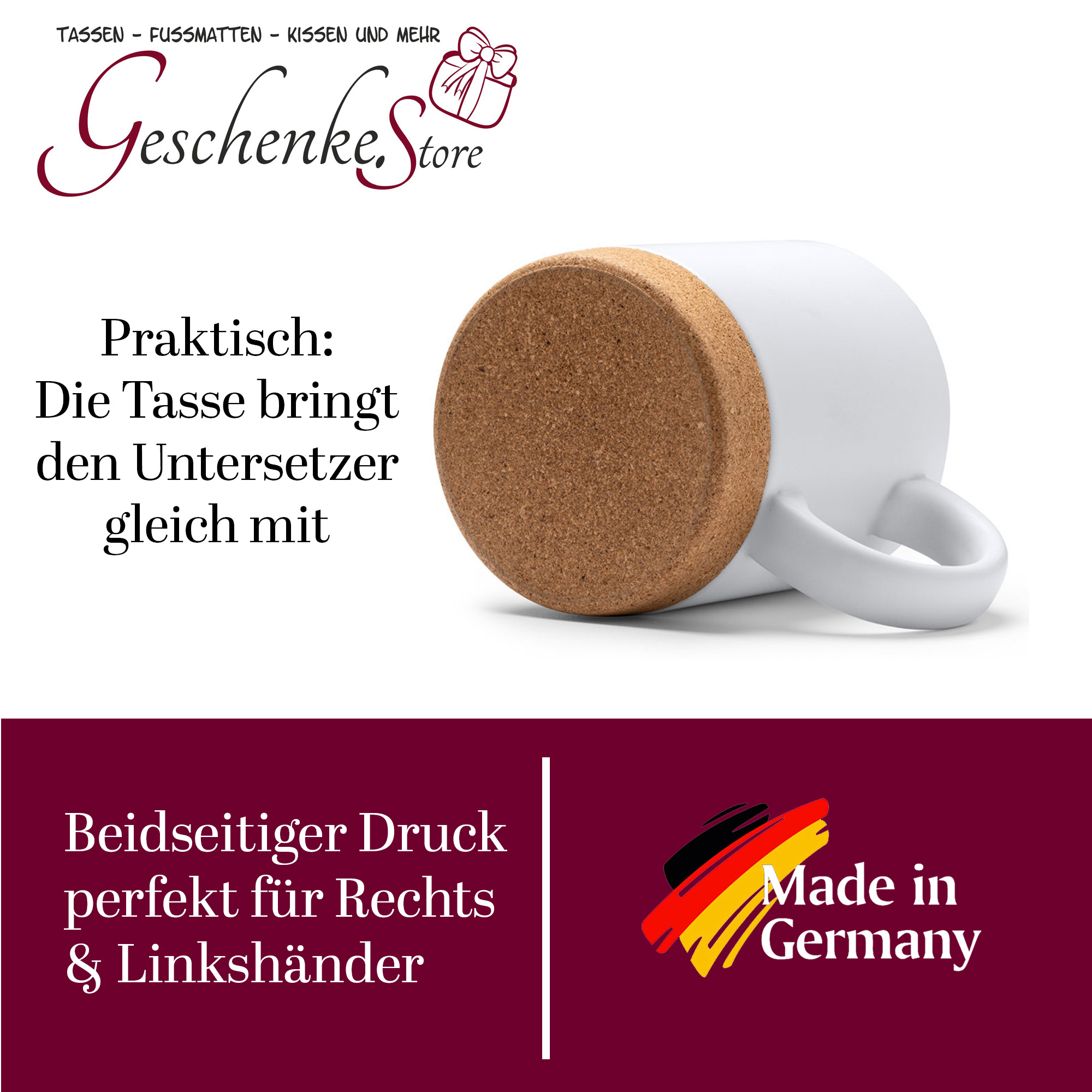 - PRAKTISCH: Die Tasse bringt den Untersetzer aus Kork gleich mit.