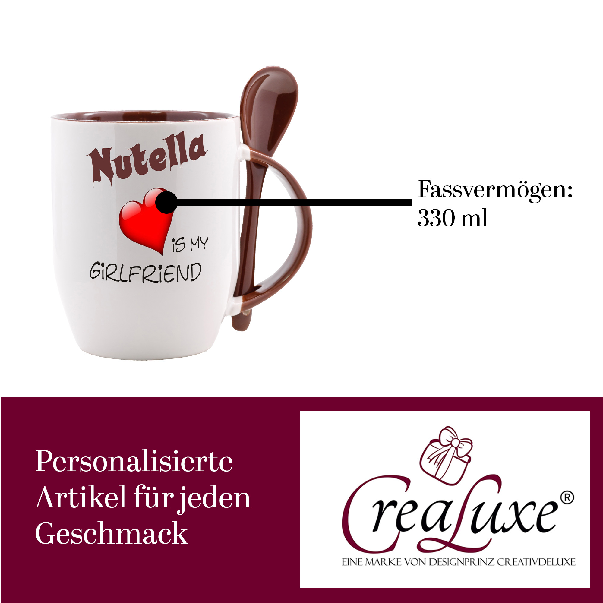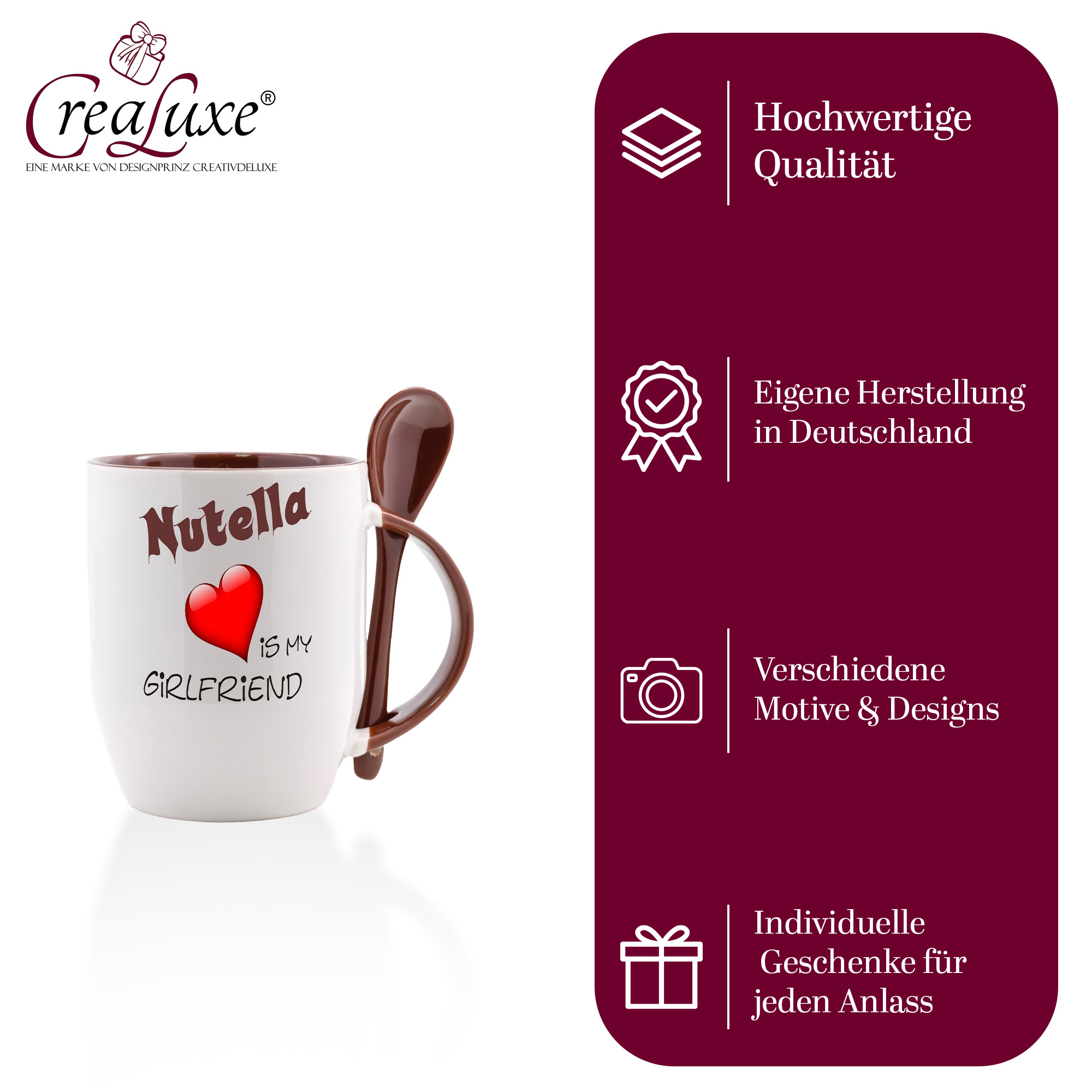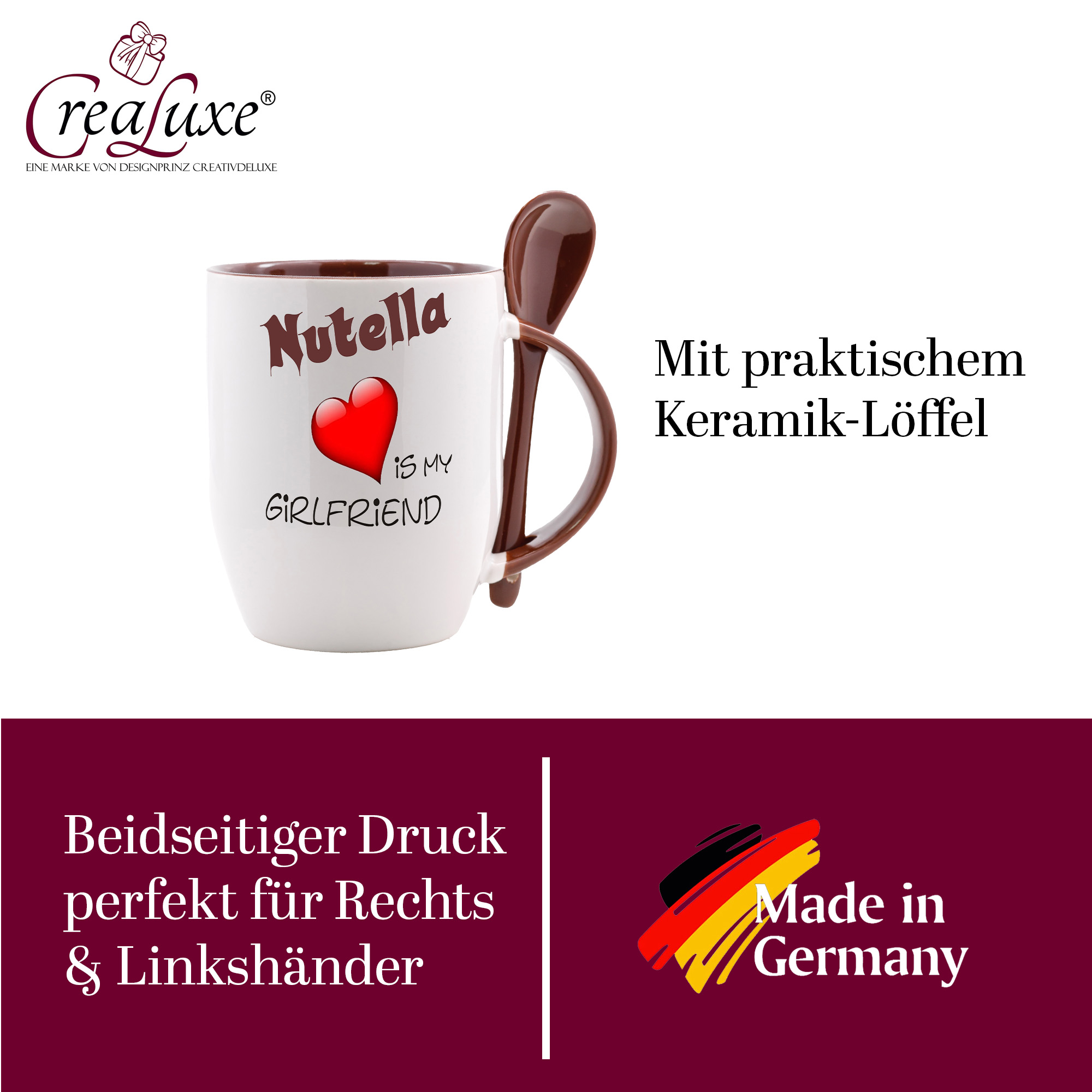 Crealuxe Löffeltasse - Nutella is my Girlfriend - Tasse mit Löffel, bedruckt, Kaffeetasse mit Motiv, Bürotasse
