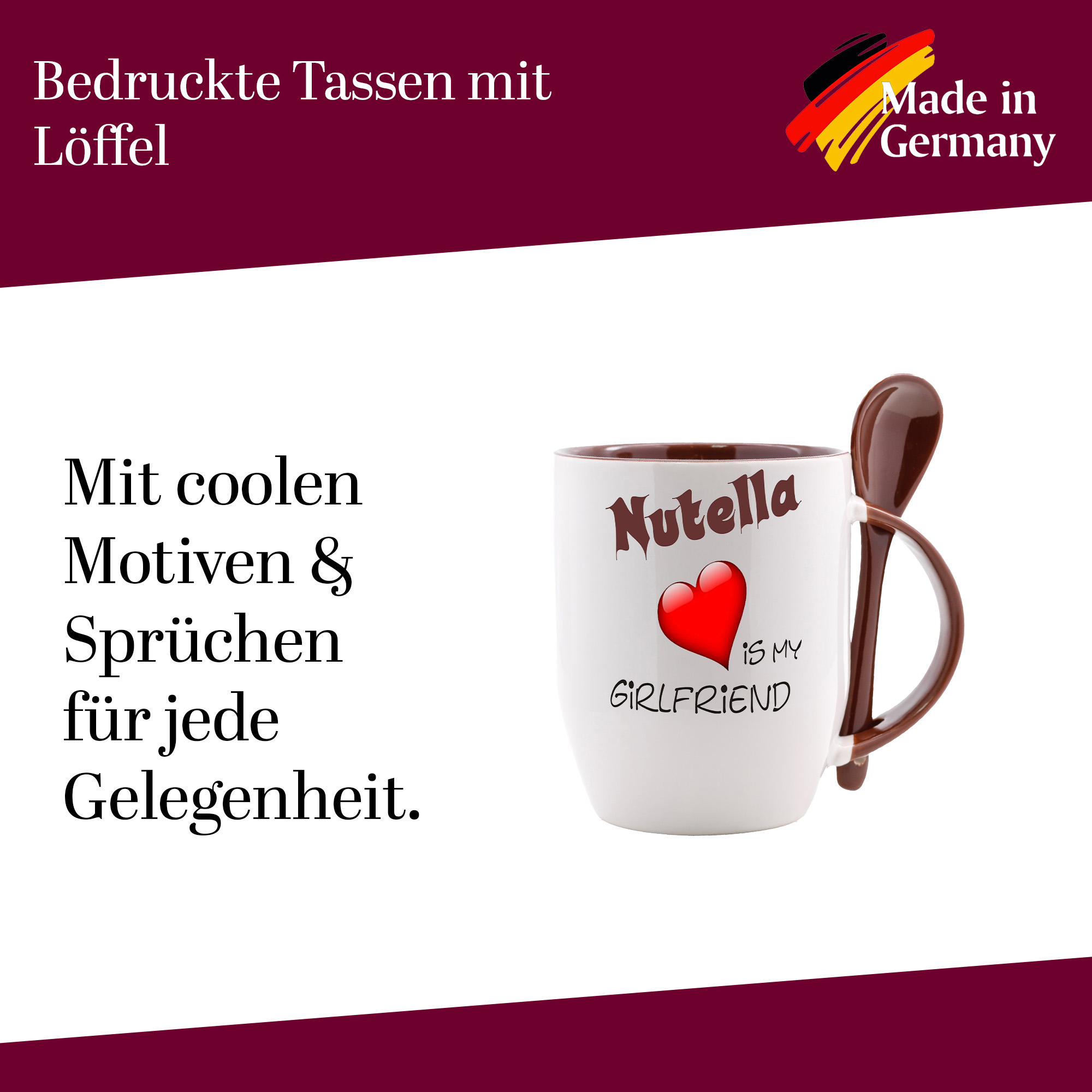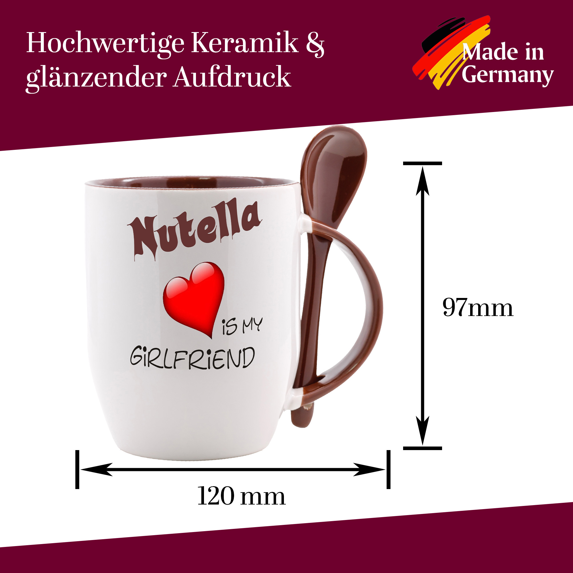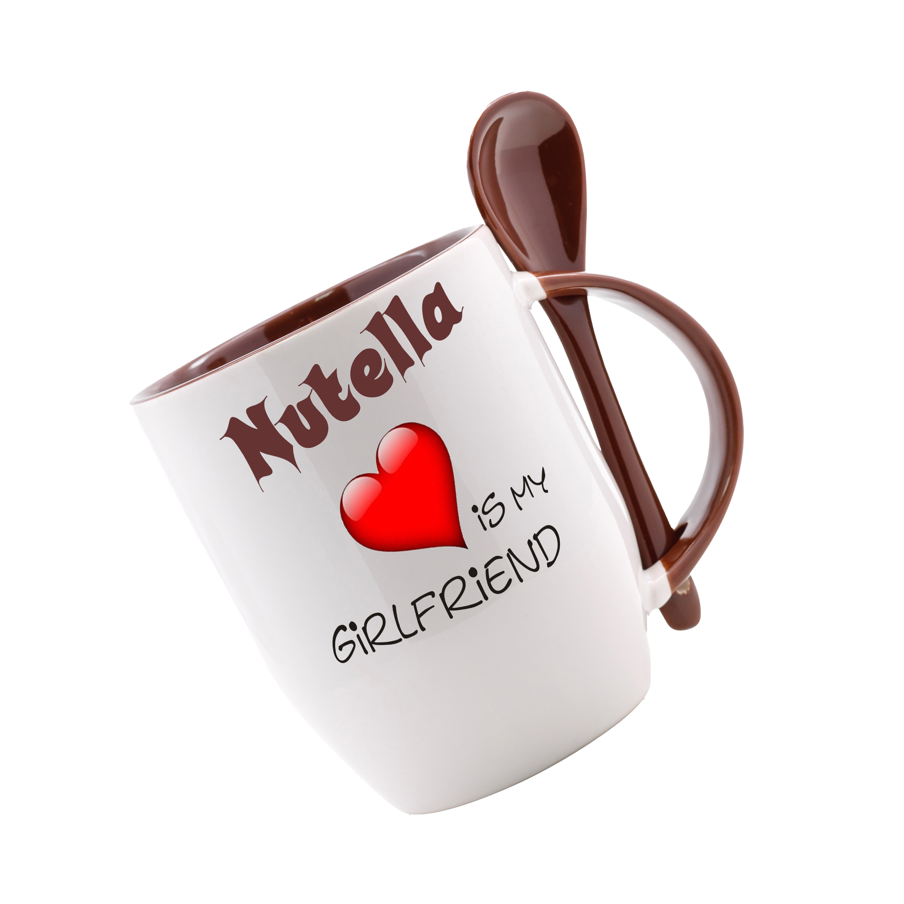 Crealuxe Löffeltasse - Nutella is my Girlfriend - Tasse mit Löffel, bedruckt, Kaffeetasse mit Motiv, Bürotasse
