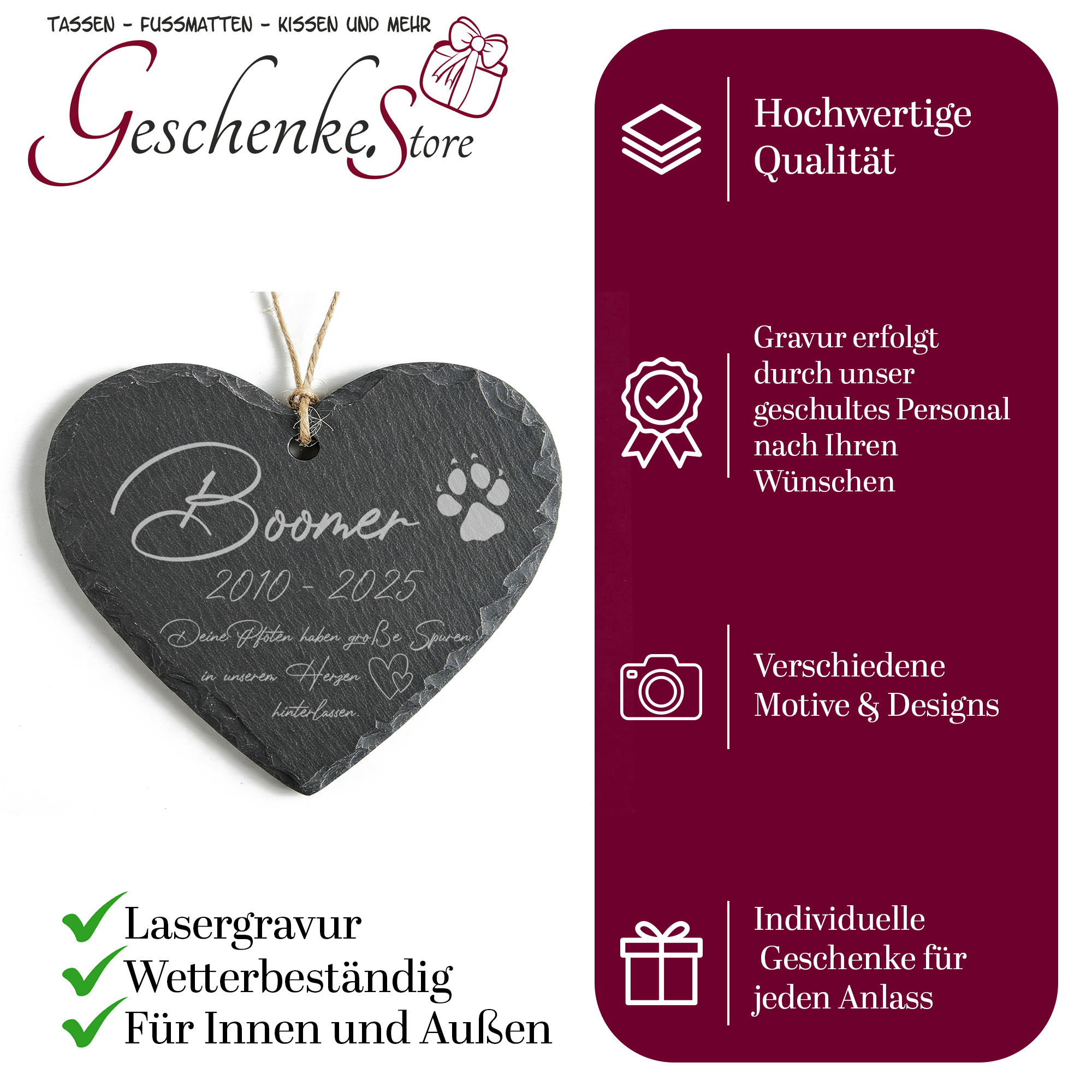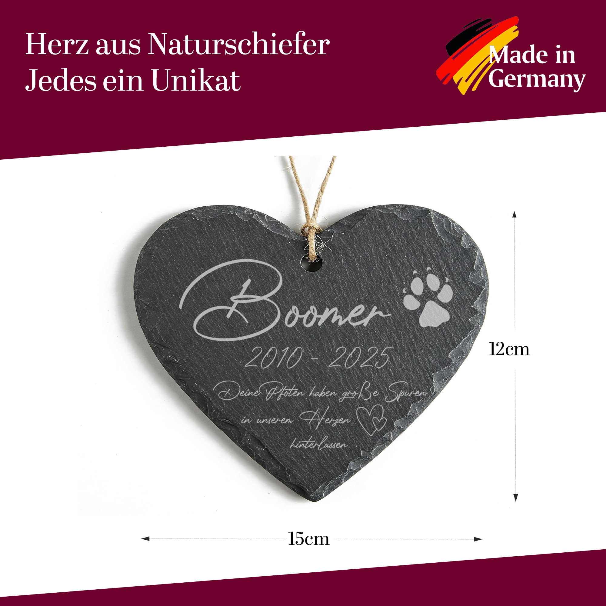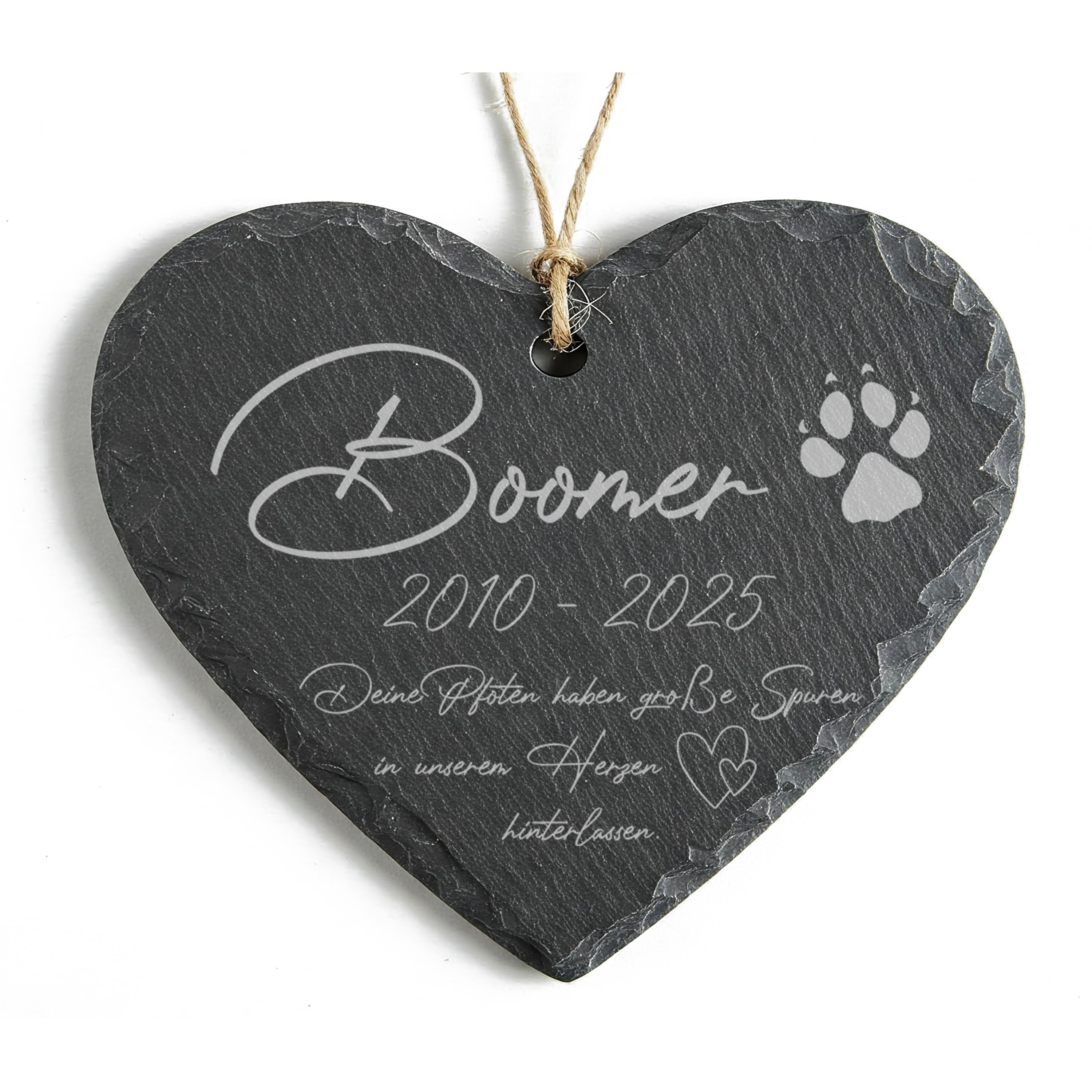 Herz aus Naturschiefer 15x12cm - Hund Katze Name + Daten - Deine Pfoten haben große Spuren in unseren Herzen hinterlassen - Erinnerungsschild – Schieferherz mit Gravur