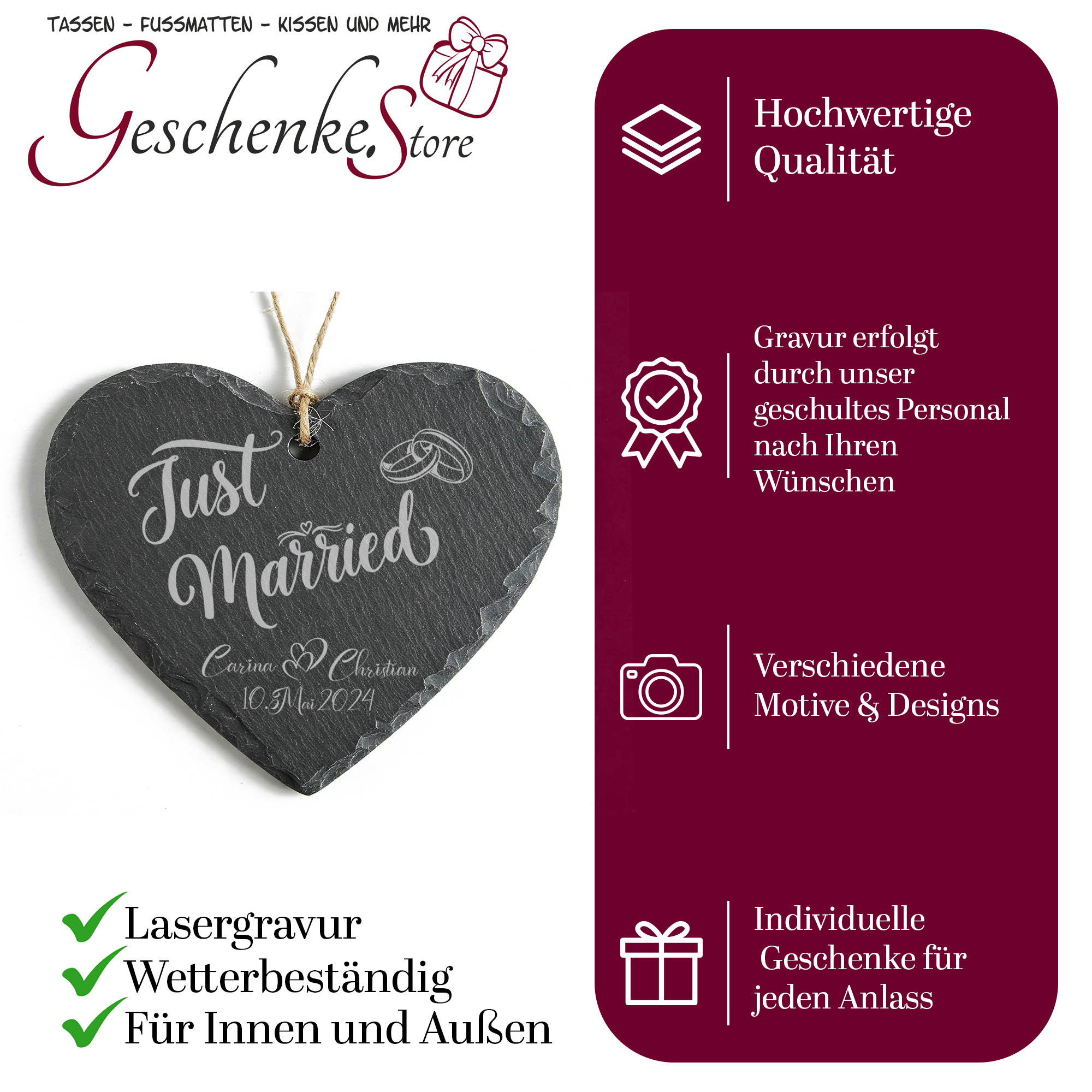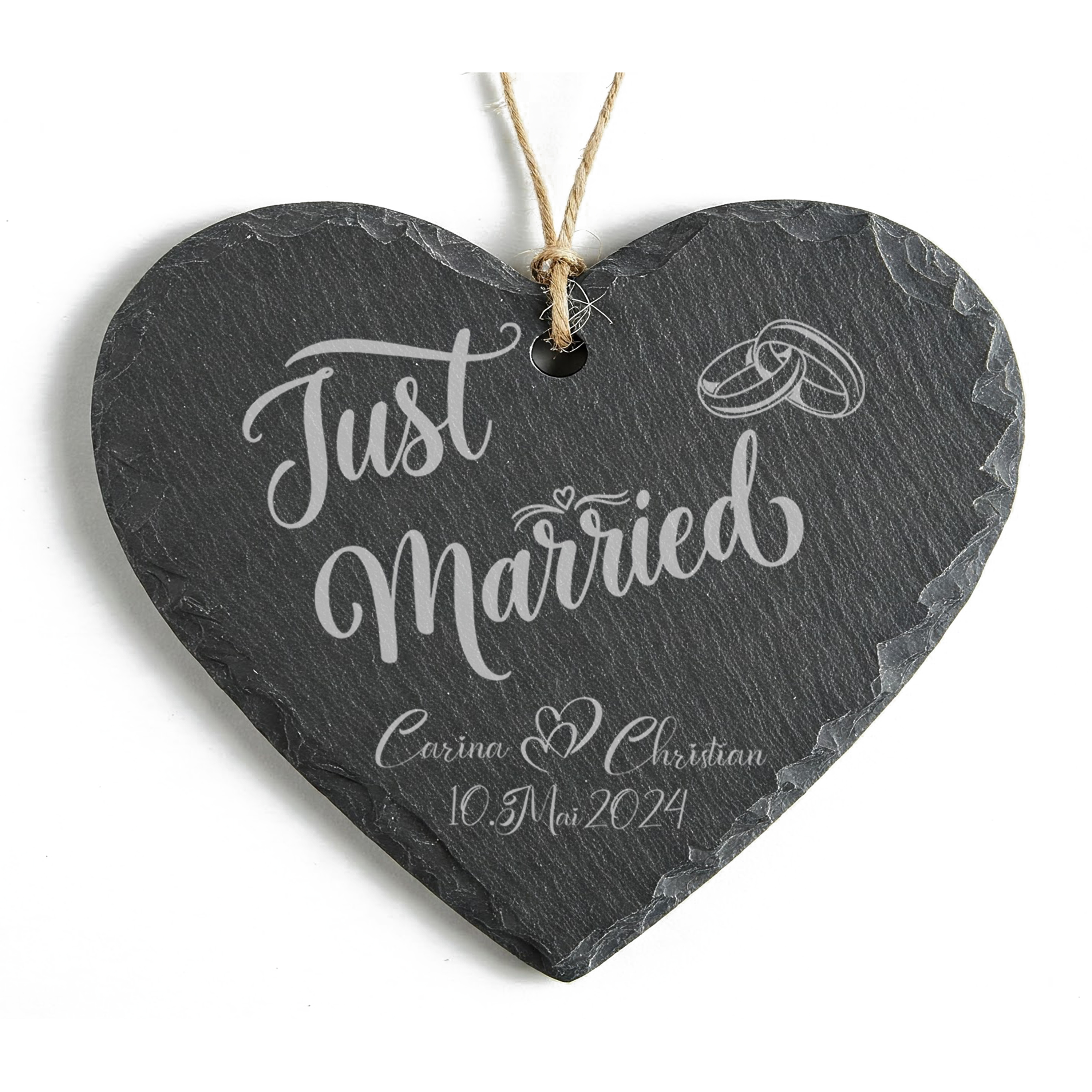 Herz aus Naturschiefer 15x12cm - Just Married Eheringe mit Namen & Datum - Hochzeitsgeschenk mit Namen – Schieferherz mit Gravur