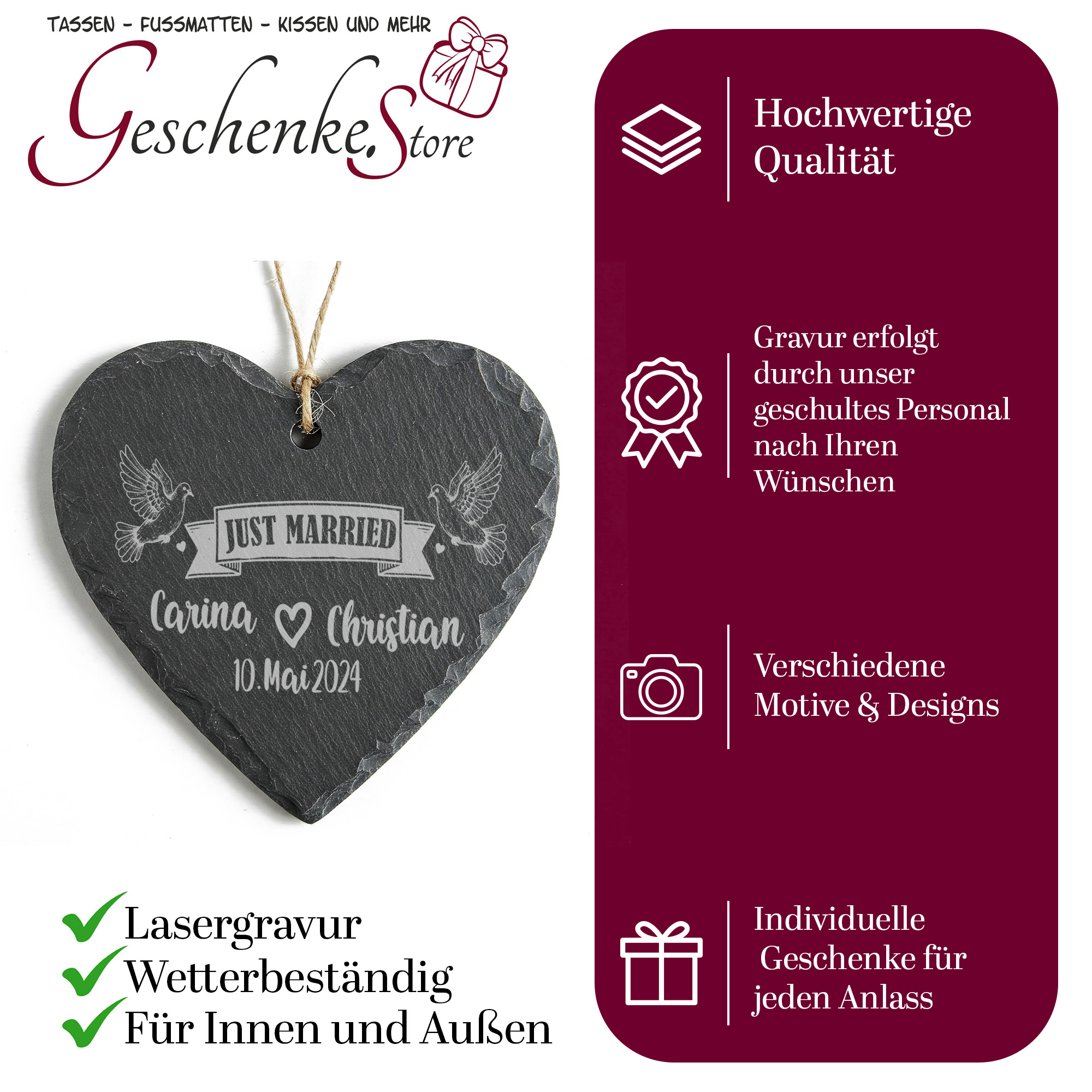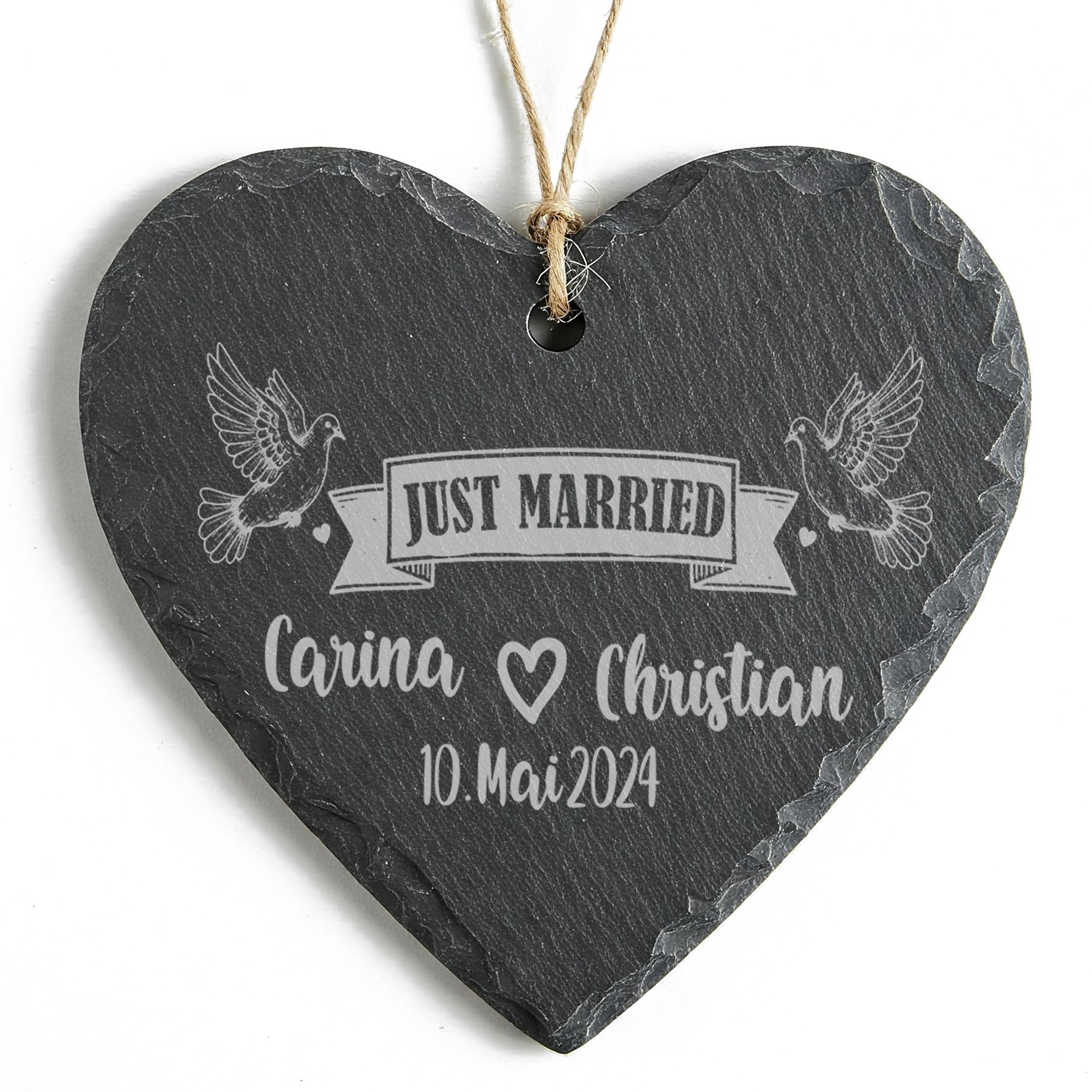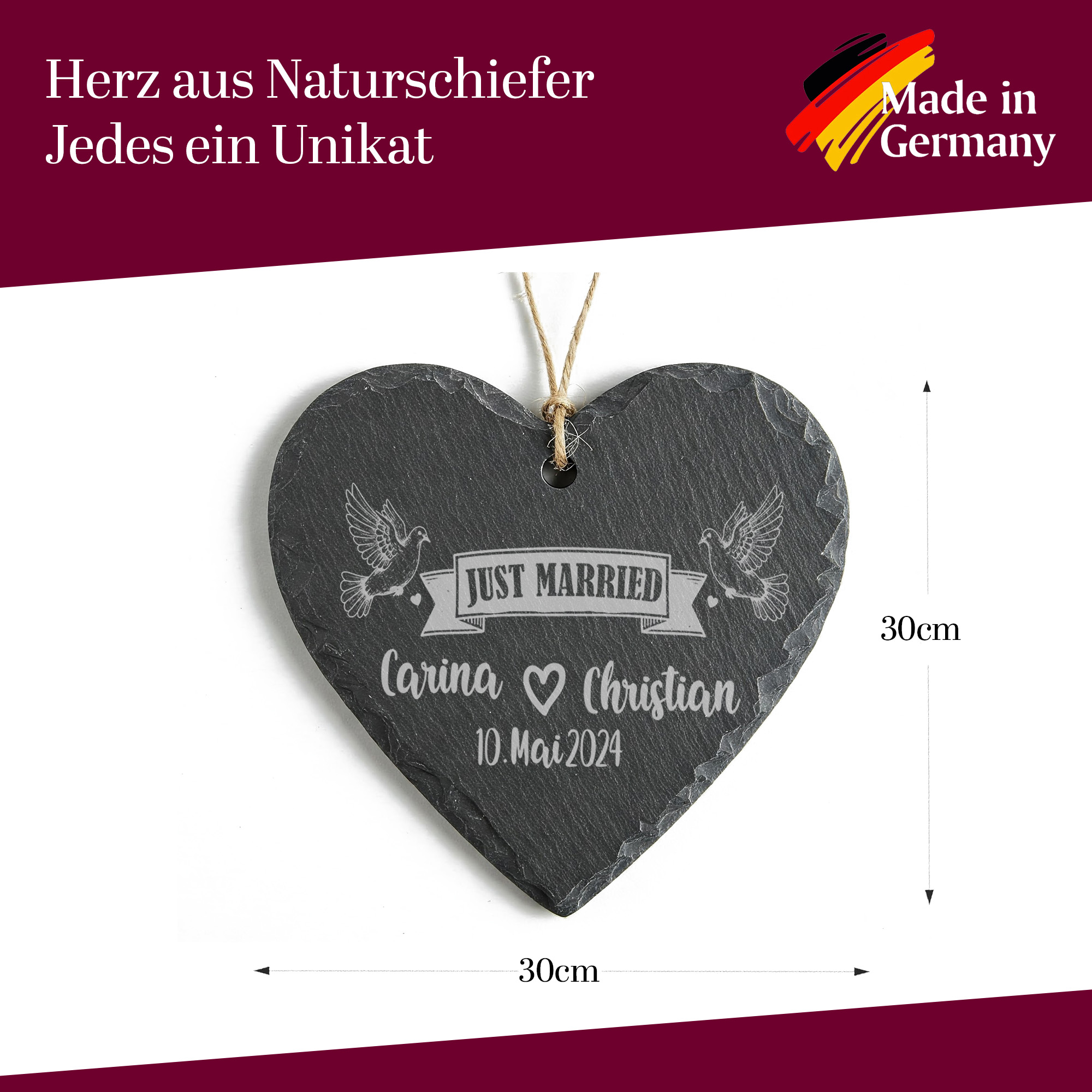 Herz aus Naturschiefer 30x30cm - Just Married Banderole Tauben mit Namen & Datum - Hochzeitsgeschenk mit Namen – Schieferherz mit Gravur