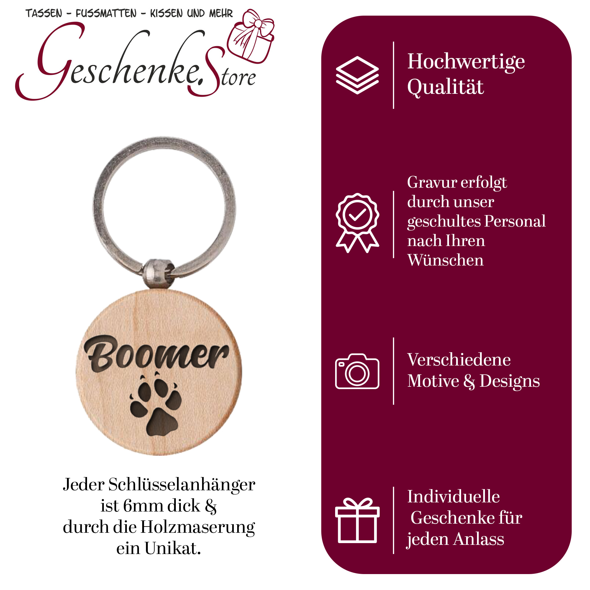 - Personalisierbar: Jeder Schlüsselanhänger kann mit Namen, Initialen oder Botschaften graviert werden.